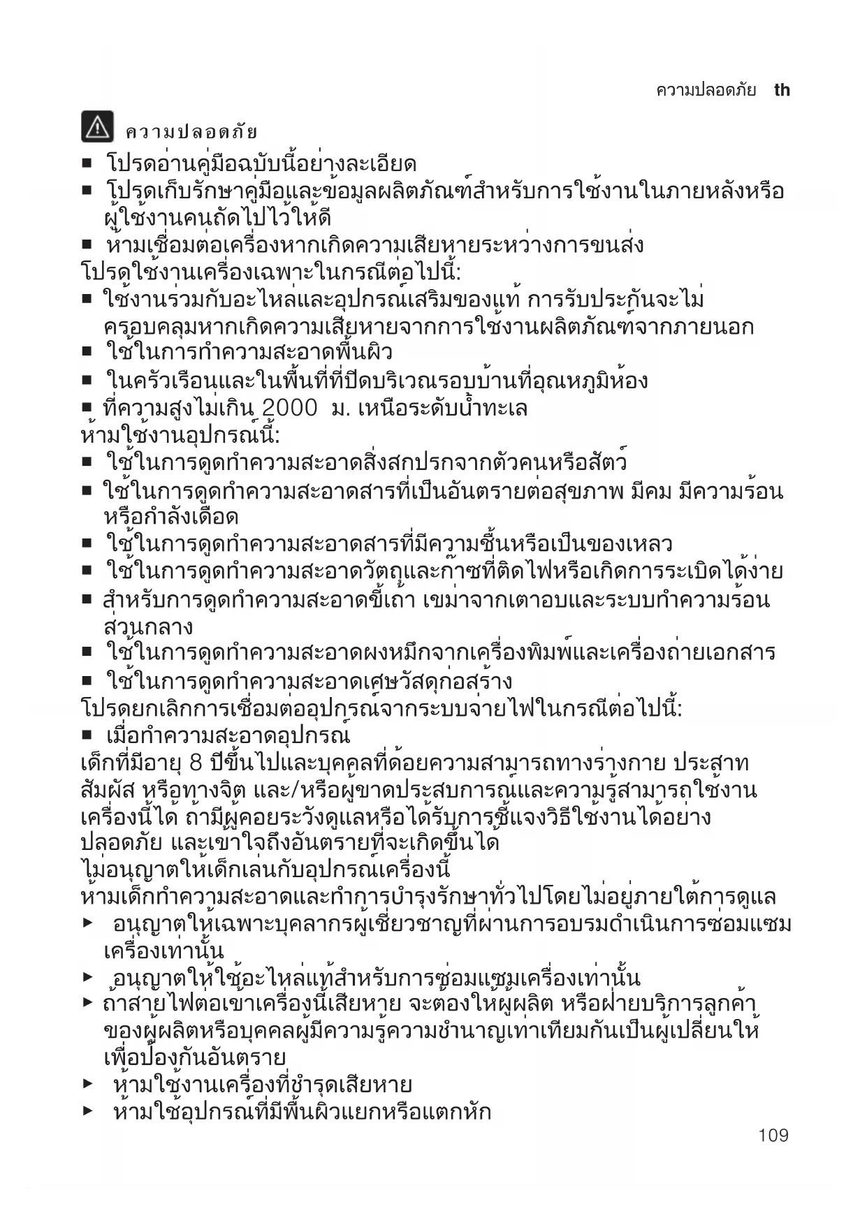 ¡ ใช้ในการดูดทำความสะอาดผงหมึกจากเครื่องพิมพ์และเครื่องถ่ายเอกสาร ¡ ใช้ในการดูดทำความสะอาดเศษวัสดุก่อสร้าง โปรดยกเลิกการเชื่อมต่ออุปกรณ์จากระบบจ่ายไฟในกรณีต่อไปนี้: ¡ เมื่อทำความสะอาดอุปกรณ์ เด็กที่มีอายุ 8 ปีขึ้นไปและบุคคลที่ด้อยความสามารถทางร่างกาย ประสาท สัมผัส หรือทางจิต และ/หรือผู้ขาดประสบการณ์และความรู้สามารถใช้งาน เครื่องนี้ได้ ถ้ามีผู้คอยระวังดูแลหรือได้รับการชี้แจงวิธีใช้งานได้อย่าง ปลอดภัย และเข้าใจถึงอันตรายที่จะเกิดขึ้นได้ ไม่อนุญาตให้เด็กเล่นกับอุปกรณ์เครื่องนี้ ห้ามเด็กทำความสะอาดและทำการบำรุงรักษาทั่วไปโดยไม่อยู่ภายใต้การดูแล ▶ อนุญาตให้เฉพาะบุคลากรผู้เชี่ยวชาญที่ผ่านการอบรมดำเนินการซ่อมแซม เครื่องเท่านั้น ▶ อนุญาตให้ใช้อะไหล่แท้สำหรับการซ่อมแซมเครื่องเท่านั้น ▶ ถ้าสายไฟต่อเข้าเครื่องนี้เสียหาย จะต้องให้ผู้ผลิต หรือฝ่ายบริการลูกค้า ของผู้ผลิตหรือบุคคลผู้มีความรู้ความชำนาญเท่าเทียมกันเป็นผู้เปลี่ยนให้ เพื่อป้องกันอันตราย ▶ ห้ามใช้งานเครื่องที่ชำรุดเสียหาย ▶ ห้ามใช้อุปกรณ์ที่มีพื้นผิวแยกหรือแตกหักth ความปลอดภัย