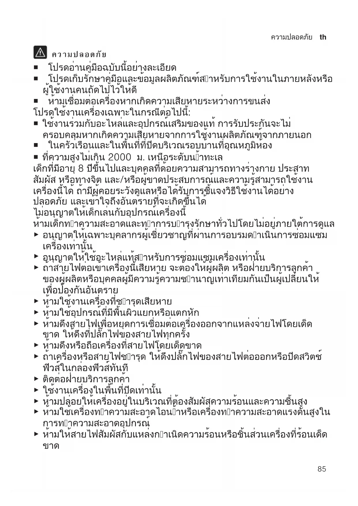 ความปลอดภัย ¡ โปรดอ่านคู่มือฉบับนี้อย่างละเอียด ¡ โปรดเก็บรักษาคู่มือและข้อมูลผลิตภัณฑ์สำหรับการใช้งานในภายหลังหรือ ผู้ใช้งานคนถัดไปไว้ให้ดี ¡ ห้ามเชื่อมต่อเครื่องหากเกิดความเสียหายระหว่างการขนส่ง โปรดใช้งานเครื่องเฉพาะในกรณีต่อไปนี้: ¡ ใช้งานร่วมกับอะไหล่และอุปกรณ์เสริมของแท้ การรับประกันจะไม่ ครอบคลุมหากเกิดความเสียหายจากการใช้งานผลิตภัณฑ์จากภายนอก ¡ ในครัวเรือนและในพื้นที่ที่ปิดบริเวณรอบบ้านที่อุณหภูมิห้อง ¡ ที่ความสูงไม่เกิน 2000 ม. เหนือระดับน้ำทะเล เด็กที่มีอายุ 8 ปีขึ้นไปและบุคคลที่ด้อยความสามารถทางร่างกาย ประสาท สัมผัส หรือทางจิต และ/หรือผู้ขาดประสบการณ์และความรู้สามารถใช้งาน เครื่องนี้ได้ ถ้ามีผู้คอยระวังดูแลหรือได้รับการชี้แจงวิธีใช้งานได้อย่าง ปลอดภัย และเข้าใจถึงอันตรายที่จะเกิดขึ้นได้ ไม่อนุญาตให้เด็กเล่นกับอุปกรณ์เครื่องนี้ ห้ามเด็กทำความสะอาดและทำการบำรุงรักษาทั่วไปโดยไม่อยู่ภายใต้การดูแล