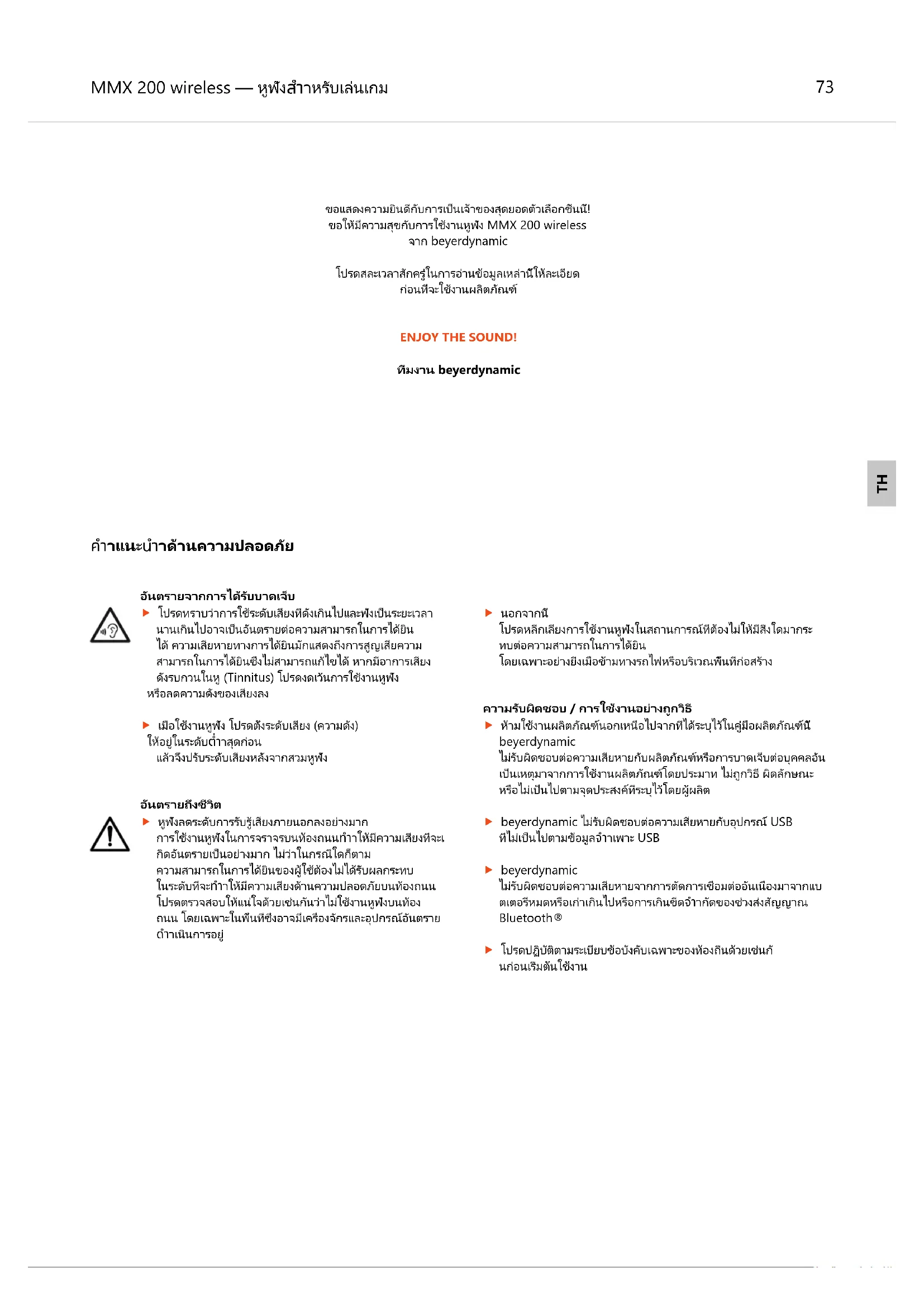โปรดหลีกเลี่ยงการใช้งานหูฟังในสถานการณ์ที่ต้องไม่ให้มีสิ่งใดมากระ ทบต่อความสามารถในการได้ยิน โดยเฉพาะอย่างยิ่งเมื่อข้ามทางรถไฟหรือบริเวณพื้นที่ก่อสร้าง ความรับผิดชอบ / การใช้งานอย่างถูกวิธี ห้ามใช้งานผลิตภัณฑ์นอกเหนือไปจากที่ได้ระบุไว้ในคู่มือผลิตภัณฑ์นี้ beyerdynamic ไม่รับผิดชอบต่อความเสียหายกับผลิตภัณฑ์หรือการบาดเจ็บต่อบุคคลอัน เป็นเหตุมาจากการใช้งานผลิตภัณฑ์โดยประมาท ไม่ถูกวิธี ผิดลักษณะ หรือไม่เป็นไปตามจุดประสงค์ที่ระบุไว้โดยผู้ผลิต beyerdynamic ไม่รับผิดชอบต่อความเสียหายกับอุปกรณ์ USB ที่ไม่เป็นไปตามข้อมูลจำาเพาะ USB beyerdynamic ไม่รับผิดชอบต่อความเสียหายจากการตัดการเชื่อมต่ออันเนื่องมาจากแบ ตเตอรี่หมดหรือเก่าเกินไปหรือการเกินขีดจำากัดของช่วงส่งสัญญาณ Bluetooth® โปรดปฏิบัติตามระเบียบข้อบังคับเฉพาะของท้องถิ่นด้วยเช่นกั นก่อนเริ่มต้นใช้งานMMX 200 wireless — หูฟังสำหรับเล่นเกม