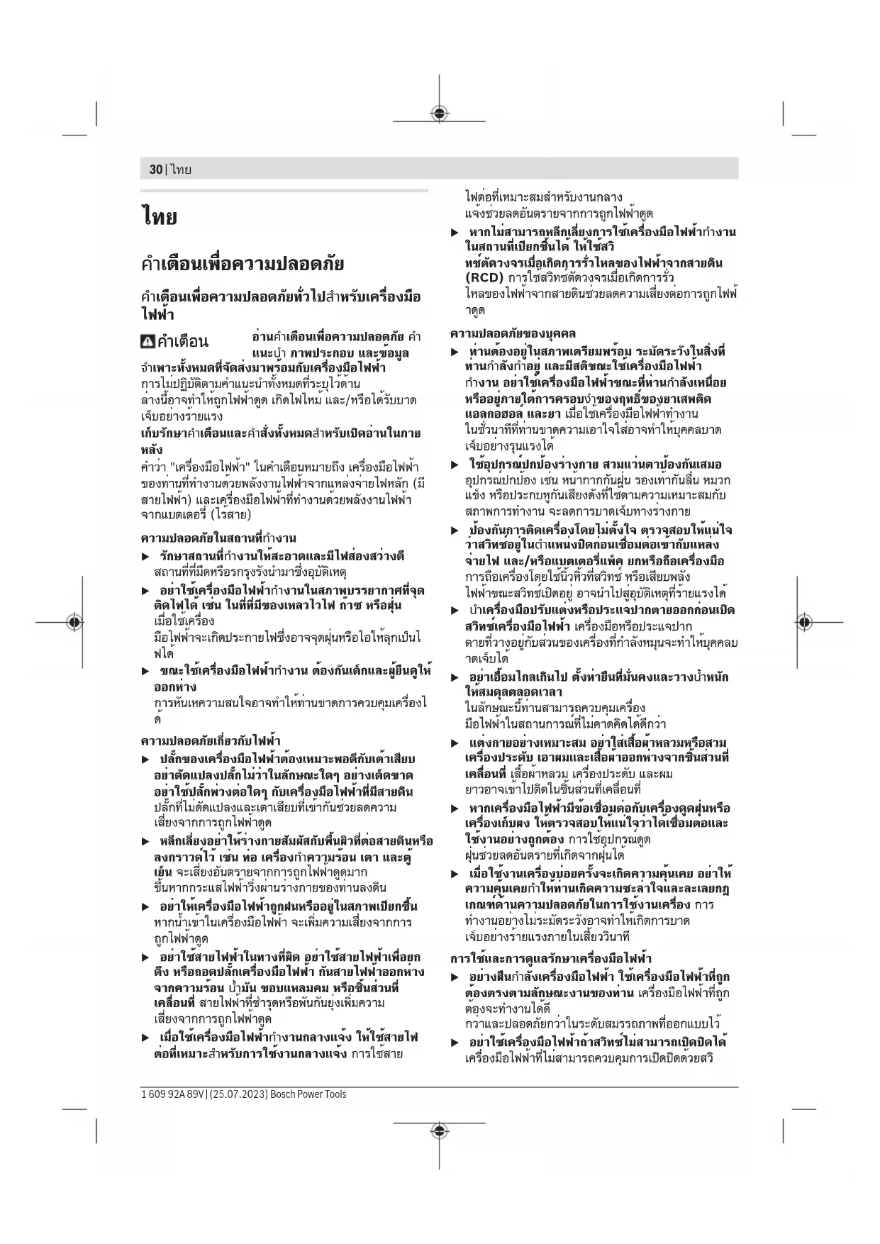 u อย่าเอื้อมไกลเกินไป ตั้งท่ายืนที่มั่นคงและวางน้ำหนัก ให้สมดุลตลอดเวลา ในลักษณะนี้ท่านสามารถควบคุมเครื่อง มือไฟฟ้าในสถานการณ์ที่ไม่คาดคิดได้ดีกว่า u แต่งกายอย่างเหมาะสม อย่าใส่เสื้อผ้าหลวมหรือสวม เครื่องประดับ เอาผมและเสื้อผ้าออกห่างจากชิ้นส่วนที่ เคลื่อนที่ เสื้อผ้าหลวม เครื่องประดับ และผม ยาวอาจเข้าไปติดในชิ้นส่วนที่เคลื่อนที่ u หากเครื่องมือไฟฟ้ามีข้อเชื่อมต่อกับเครื่องดูดฝุ่นหรือ เครื่องเก็บผง ให้ตรวจสอบให้แน่ใจว่าได้เชื่อมต่อและ ใช้งานอย่างถูกต้อง การใช้อุปกรณ์ดูด ฝุ่นช่วยลดอันตรายที่เกิดจากฝุ่นได้ u เมื่อใช้งานเครื่องบ่อยครั้งจะเกิดความคุ้นเคย อย่าให้ ความคุ้นเคยทำให้ท่านเกิดความชะล่าใจและละเลยกฎ เกณฑ์ด้านความปลอดภัยในการใช้งานเครื่อง การ ทำงานอย่างไม่ระมัดระวังอาจทำให้เกิดการบาด เจ็บอย่างร้ายแรงภายในเสี้ยววินาที การใช้และการดูแลรักษาเครื่องมือไฟฟ้า u อย่างฝืนกำลังเครื่องมือไฟฟ้า ใช้เครื่องมือไฟฟ้าที่ถูก ต้องตรงตามลักษณะงานของท่าน เครื่องมือไฟฟ้าที่ถูก ต้องจะทำงานได้ดี กว่าและปลอดภัยกว่าในระดับสมรรถภาพที่ออกแบบไว้ u อย่าใช้เครื่องมือไฟฟ้าถ้าสวิทช์ไม่สามารถเปิดปิดได้ เครื่องมือไฟฟ้าที่ไม่สามารถควบคุมการเปิดปิดด้วยสวิ 1 609 92A 89V | (25.07.2023) Bosch Power Toolsไทย | 31 ทช์ได้ เป็นเครื่อง มือไฟฟ้าที่ไม่ปลอดภัยและต้องส่งซ่อมแซม u ก่อนปรับแต่งเครื่อง เปลี่ยนอุปกรณ์ประกอบ หรือเก็บ เครื่องเข้าที่ ต้องถอดปลั๊กออกจากแหล่งจ่ายไฟ และ/ หรือถอดแบตเตอรี่แพ็คออกจากเครื่องมือไฟฟ้าหาก