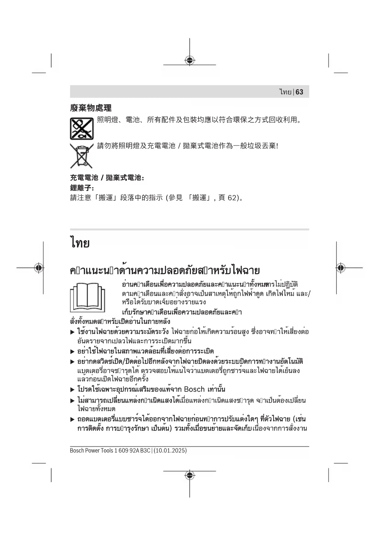 ถอดแบตเตอรี่แบบชาร์จได้ออกจากไฟฉายก่อนทำการปรับแต่งใดๆ ที่ตัวไฟฉาย (เช่น การติดตั้ง การบำรุงรักษา เป็นต้น) รวมทั้งเมื่อขนย้ายและจัดเก็บ เนื่องจากการสั่งงาน Bosch Power Tools 1 609 92A B3C | (10.01.2025)64 | ไทย สวิตช์เปิด/ปิดโดยไม่ตั้งใจขณะทำงานดังกล่าวอาจก่อให้เกิดความเสี่ยงต่อการบาดเจ็บ