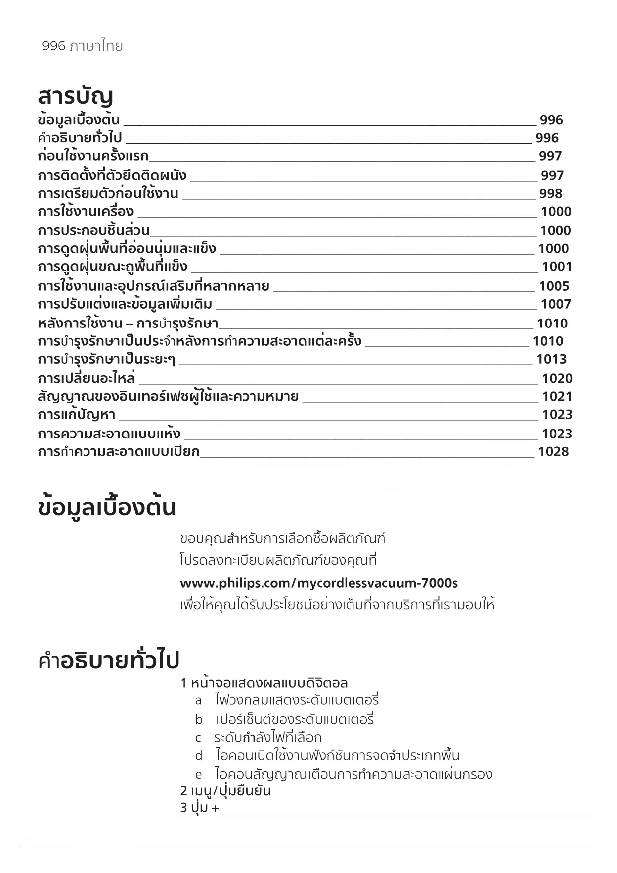 ข้อมูลเบื้องต้น _______________________________________________________________ 996 คำอธิบายทั่วไป ______________________________________________________________ 996 ก่อนใช้งานครั้งแรก___________________________________________________________ 997 การติดตั้งที่ตัวยึดติดผนัง _____________________________________________________ 997 การเตรียมตัวก่อนใช้งาน ______________________________________________________ 998 การใช้งานเครื่อง _____________________________________________________________ 1000 การประกอบชิ้นส่วน___________________________________________________________ 1000 การดูดฝุ่นพื้นที่อ่อนนุ่มและแข็ง ________________________________________________ 1000 การดูดฝุ่นขณะถูพื้นที่แข็ง _____________________________________________________ 1001 การใช้งานและอุปกรณ์เสริมที่หลากหลาย ________________________________________ 1005 การปรับแต่งและข้อมูลเพิ่มเติม _________________________________________________ 1007 หลังการใช้งาน – การบำรุงรักษา________________________________________________ 1010 การบำรุงรักษาเป็นประจำหลังการทำความสะอาดแต่ละครั้ง _________________________ 1010 การบำรุงรักษาเป็นระยะๆ ______________________________________________________ 1013 การเปลี่ยนอะไหล่ _____________________________________________________________ 1020 สัญญาณของอินเทอร์เฟซผู้ใช้และความหมาย ____________________________________ 1021 การแก้ปัญหา ________________________________________________________________ 1023 การความสะอาดแบบแห้ง ______________________________________________________ 1023 การทำความสะอาดแบบเปียก___________________________________________________ 1028 ข้อมูลเบื้องต้น ขอบคุณสำหรับการเลือกซื้อผลิตภัณฑ์ โปรดลงทะเบียนผลิตภัณฑ์ของคุณที่ www.philips.com/mycordlessvacuum-7000s เพื่อให้คุณได้รับประโยชน์อย่างเต็มที่จากบริการที่เรามอบให้ คำอธิบายทั่วไป 1 หน้าจอแสดงผลแบบดิจิตอล a ไฟวงกลมแสดงระดับแบตเตอรี่ b เปอร์เซ็นต์ของระดับแบตเตอรี่ c ระดับกำลังไฟที่เลือก d ไอคอนเปิดใช้งานฟังก์ชันการจดจำประเภทพื้น e ไอคอนสัญญาณเตือนการทำความสะอาดแผ่นกรอง 2 เมนู/ปุ่มยืนยัน 3 ปุ่ม +997