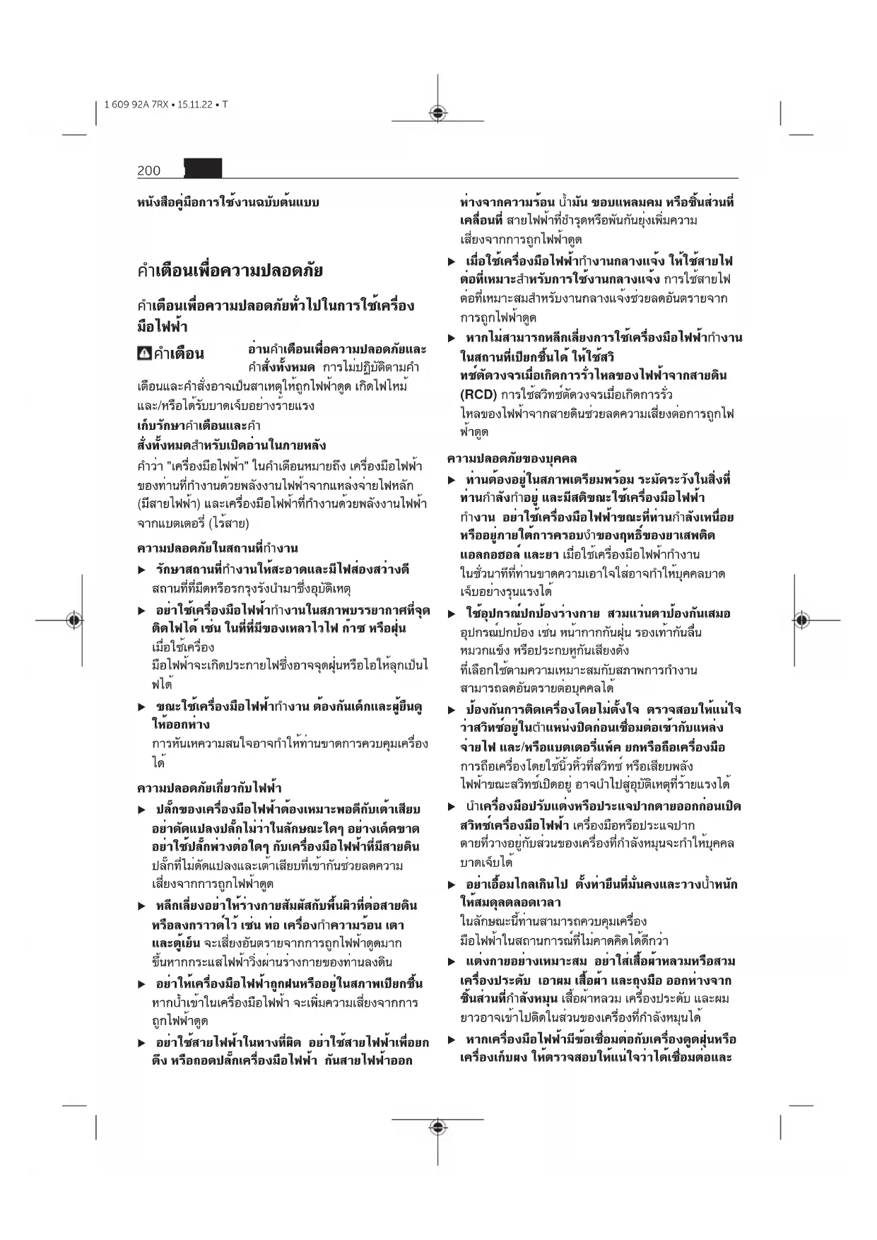 운반 단락에 나와 있는 지침을 참고하십시오 (참조 „운 반“, 페이지199). ko 199 1 609 92A 7RX • 15.11.22 • Tหนังสือคู่มือการใช้งานฉบับต้นแบบ คำเตือนเพื่อความปลอดภัยไทย คำเตือนเพื่อความปลอดภัยทั่วไปในการใช้เครื่อง มือไฟฟ้าไทย