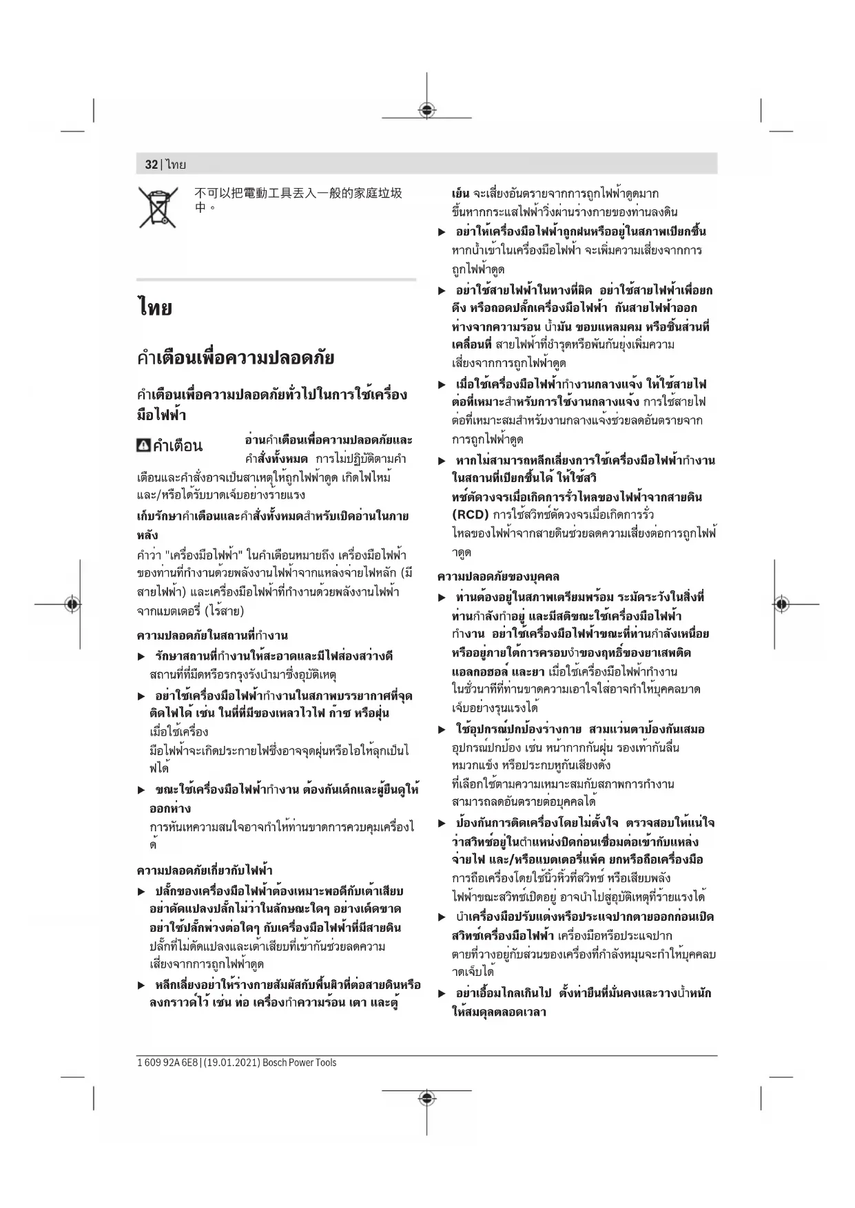 u อย่าเอื้อมไกลเกินไป ตั้งท่ายืนที่มั่นคงและวางน้ำหนัก ให้สมดุลตลอดเวลา 1 609 92A 6E8 | (19.01.2021) Bosch Power Toolsไทย | 33 ในลักษณะนี้ท่านสามารถควบคุมเครื่อง มือไฟฟ้าในสถานการณ์ที่ไม่คาดคิดได้ดีกว่า u แต่งกายอย่างเหมาะสม อย่าใส่เสื้อผ้าหลวมหรือสวม เครื่องประดับ เอาผม เสื้อผ้า และถุงมือ ออกห่างจาก ชิ้นส่วนที่กำลังหมุน เสื้อผ้าหลวม เครื่องประดับ และผม ยาวอาจเข้าไปติดในส่วนของเครื่องที่กำลังหมุนได้ u หากเครื่องมือไฟฟ้ามีข้อเชื่อมต่อกับเครื่องดูดฝุ่นหรือ เครื่องเก็บผง ให้ตรวจสอบให้แน่ใจว่าได้เชื่อมต่อและ ใช้งานอย่างถูกต้อง การใช้อุปกรณ์ดูด ฝุ่นช่วยลดอันตรายที่เกิดจากฝุ่นได้ การใช้และการดูแลรักษาเครื่องมือไฟฟ้า u อย่างฝืนกำลังเครื่องมือไฟฟ้า ใช้เครื่องมือไฟฟ้าที่ถูก ต้องตรงตามลักษณะงานของท่าน เครื่องมือไฟฟ้าที่ถูก ต้องจะทำงานได้ดี กว่าและปลอดภัยกว่าในระดับสมรรถภาพที่ออกแบบไว้ u อย่าใช้เครื่องมือไฟฟ้าถ้าสวิทช์ไม่สามารถเปิดปิดได้ เครื่องมือไฟฟ้าที่ไม่สามารถควบคุมการเปิดปิดด้วยสวิ ทช์ได้ เป็นเครื่อง มือไฟฟ้าที่ไม่ปลอดภัยและต้องส่งซ่อมแซม u ก่อนปรับแต่งเครื่อง เปลี่ยนอุปกรณ์ประกอบ หรือเก็บ เครื่องมือไฟฟ้าเข้าที่ ต้องถอดปลั๊กไฟออกจากแหล่ง จ่ายไฟ และ/หรือถอดแบตเตอรี่แพ็คออกจากเครื่องมือ ไฟฟ้า มาตรการป้องกันเพื่อความปลอดภัยนี้ช่วยลดความ เสี่ยงจากการติดเครื่องโดยไม่ได้ตั้งใจ u เมื่อเลิกใช้งานเครื่องมือไฟฟ้า ให้เก็บเครื่องไว้ในที่ที่ เด็กหยิบไม่ถึง และไม่อนุญาตให้บุคคลที่ไม่คุ้นเคยกับ เครื่องหรือบุคคลที่ไม่ได้อ่านคำแนะนำเหล่านี้ใช้เครื่อง เครื่องมือไฟฟ้าเป็นของอันตรายหากตกอยู่ในมือของผู้ ใช้ที่ไม่ได้รับการฝึกฝน u บำรุงรักษาเครื่องมือไฟฟ้า ตรวจสอบชิ้นส่วนที่ เคลื่อนที่ว่าวางไม่ตรงแนวหรือติดขัดหรือไม่ ตรวจหา การแตกหักของชิ้นส่วนและสภาพอื่นใดที่อาจมีผลต่อ การทำงานของเครื่องมือไฟฟ้า หากชำรุดต้องส่ง เครื่องมือไฟฟ้าไปซ่อมแซมก่อนใช้งาน อุบัติเหตุหลาย อย่างเกิดขึ้นเนื่องจากดูแลรักษาเครื่องไม่ดีพอ u รักษาเครื่องมือตัดให้คมและสะอาด หากบำรุงรักษาเครื่องมือที่มีขอบตัดแหลมคมอย่างถูกต้อง จะสามารถตัดได้ลื่นไม่ติดขัดและควบคุมได้ง่ายกว่า u ใช้เครื่องมือไฟฟ้า อุปกรณ์ประกอบ เครื่องมือ และอุปก รณ์อื่นๆ ตรงตามคำแนะนำเหล่านี้ โดยคำนึงถึง เงื่อนไขการทำงานและงานที่จะทำ การใช้เครื่อง มือไฟฟ้าทำงานที่ต่างไปจากวัตถุประสงค์การ ใช้งานของเครื่อง อาจนำไปสู่สถานการณ์ที่เป็นอันตรายได้