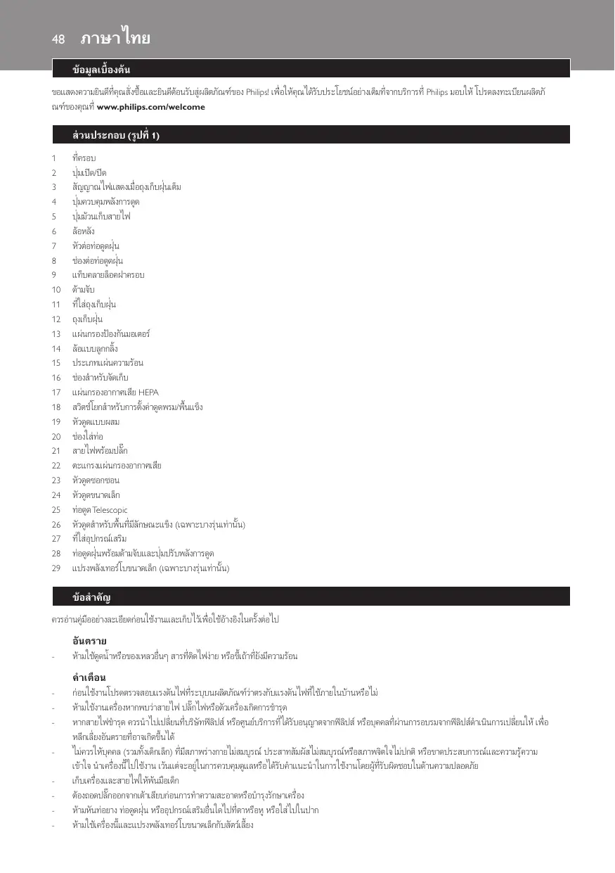 Orifice de raccordement du flexible Languette de déverrouillage du couvercle Poignée Support du sac Sac Filtre de protection du moteur Roulette pivotante Plaque signalétique Insert pour rangement du tube Filtre sortie HEPA Sélecteur pour moquettes/sols durs Brosse standard Insert pour rangement du tube Cordon d’alimentation avec fiche secteur Grille du filtre sortie Suceur plat Petite brosse -- Si le cordon d’alimentation est endommagé, il doit être remplacé par Philips, par un Centre Service Agréé Philips ou par un technicien qualifié afin d’éviter tout accident.