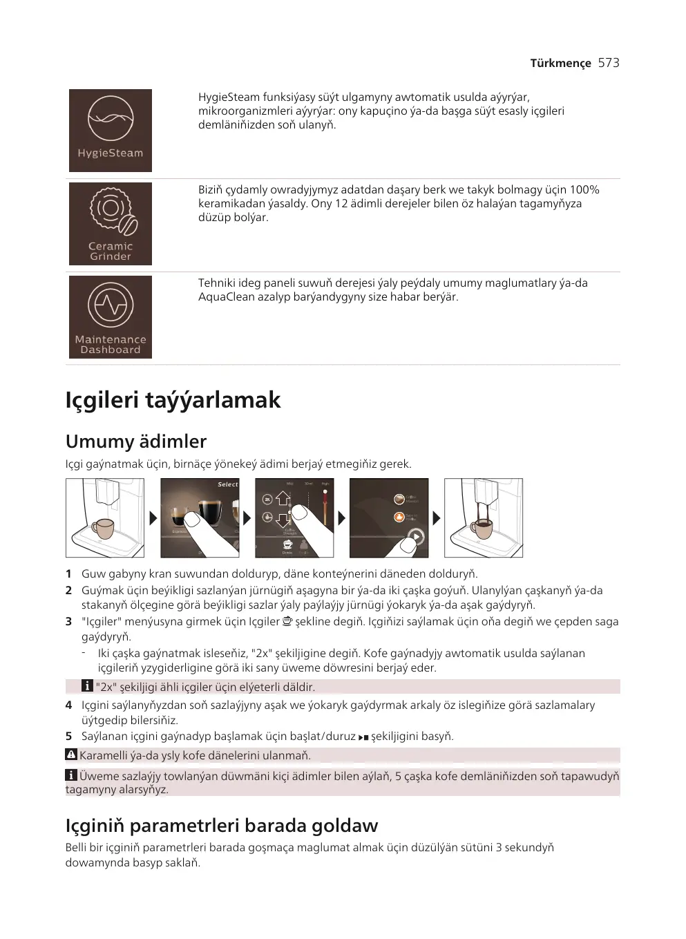 1 Üwelen kofe bölüminiň gapagyny açyň we bir ölçeg çemçejik üwelen kofeden oňa guýuň. Soňra gapagy ýapyň. 2 Içgiler şekiljigine degiň, çepden saga saraň we içgiňiziň saýlaň. 3 Üwelen kofe şekiljige degiň. 4 Sazlaýjyny ýokaryk we aşak gaýdyrmak arkaly öz islegiňize görä sazlamalary üýtgedip bilersiňiz. 5 Saýlanan içgini gaýnadyp başlamak üçin başlat/duruz şekiljigini basyň. Eger üwelen kofe saýlasaňyz, kofäniň ajylygyny sazlap ýa-da bir gezekde bir içişden artyk taýýarlap bilmersiňiz.