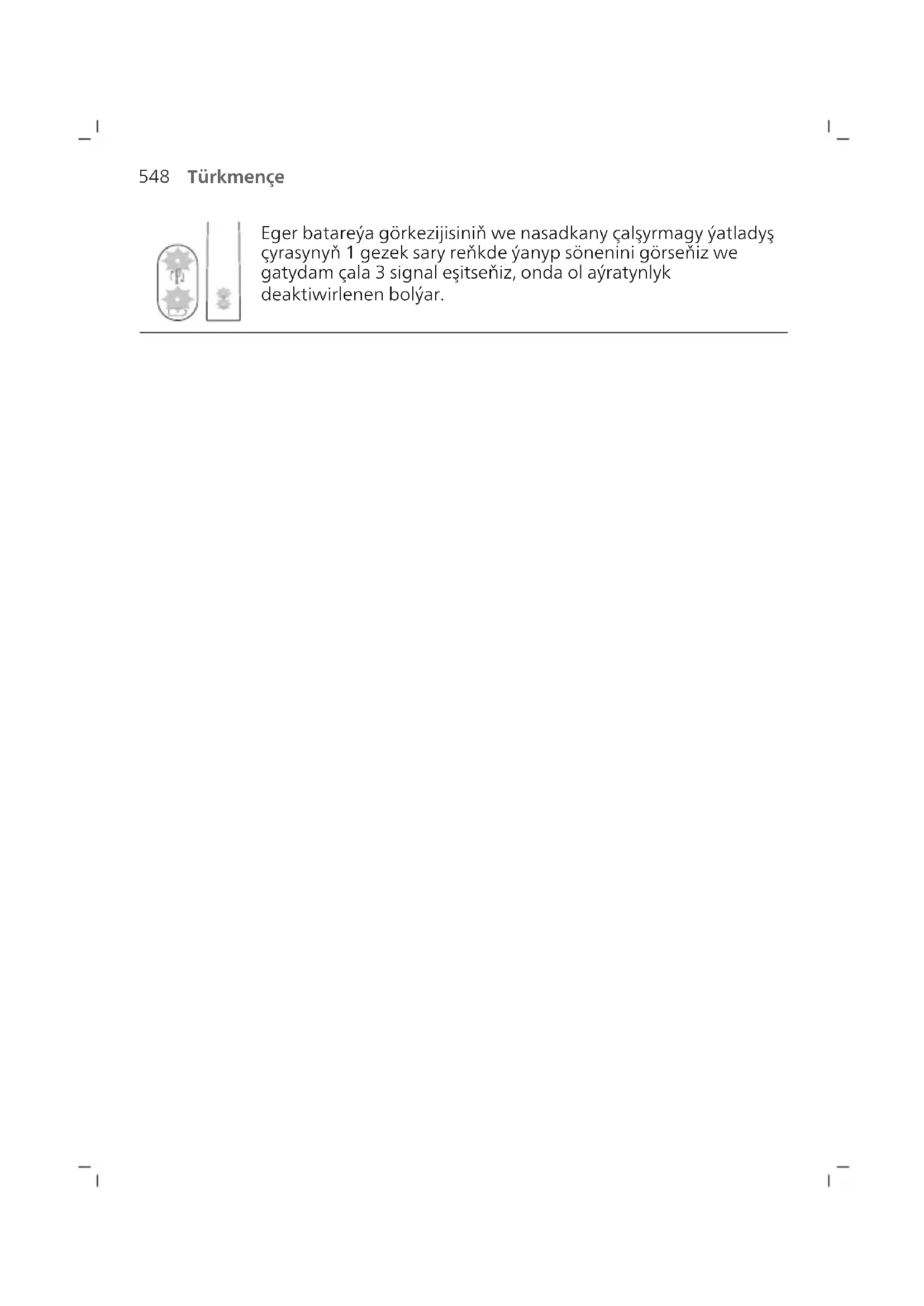 Eger batareýa görkezijisiniň we nasadkany çalşyrmagy ýatladyş çyrasynyň 2 gezek ýaşyl reňkde ýanyp sönenini görseňiz we çaladan gata 3 signal eşitseňiz, onda ol aýratynlyk işjeňleşen bolýar. ÝA-DA548 Türkmençe Eger batareýa görkezijisiniň we nasadkany çalşyrmagy ýatladyş çyrasynyň 1 gezek sary reňkde ýanyp sönenini görseňiz we gatydam çala 3 signal eşitseňiz, onda ol aýratynlyk deaktiwirlenen bolýar.549 Türkmençe Ultramelewşe dezinfektor Bellik: Esbaplar satyn alnan modele görä dürlüçe bolup biler. Ultramelewşe arassalaýjy bilen çotgaňyzyň uçlaryny her gezek ulanyşdan soň arassalap bilersiňiz. Eger aşakdaky ýagdaýlarr ýüze çyksa, dezinfektory tokdan sogrup, ulanmagy bes ediň we Müşderi idegine jaň ediň: - Gapy açyk wagty ultramelewşe çyrasy gýanyp durýar. - Dezinfektoryň penjiresi döwlen ýa-da ýok. - Dezinfektor işläp durka tüsse çykarýar ýa-da ýanygyň ysy gelýär. Bellik: Ultramelewşe çyra adamyň gözüne we tenine zyýanly bolup bilýär. Bu enjamy hemişe çagalaryň el ýeterinden uzakda saklamaly.