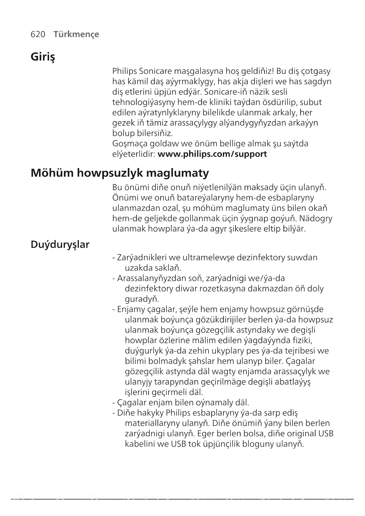 Türkmençe Giriş Philips Sonicare maşgalasyna hoş geldiňiz! Bu diş çotgasy has kämil daş aýyrmaklygy, has akja dişleri we has sagdyn diş etlerini üpjün edýär. Sonicare-iň näzik sesli tehnologiýasyny hem-de kliniki taýdan ösdürilip, subut edilen aýratynlyklaryny bilelikde ulanmak arkaly, her gezek iň tämiz arassaçylygy alýandygyňyzdan arkaýyn bolup bilersiňiz. Goşmaça goldaw we önüm bellige almak şu saýtda elýeterlidir: www.philips.com/support Möhüm howpsuzlyk maglumaty Bu önümi diňe onuň niýetlenilýän maksady üçin ulanyň. Önümi we onuň batareýalaryny hem-de esbaplaryny ulanmazdan ozal, şu möhüm maglumaty üns bilen okaň hem-de geljekde gollanmak üçin ýygnap goýuň. Nädogry ulanmak howplara ýa-da agyr şikeslere eltip bilýär. Duýduryşlar - Zarýadnikleri we ultramelewşe dezinfektory suwdan uzakda saklaň. - Arassalanyňyzdan soň, zarýadnigi we/ýa-da dezinfektory diwar rozetkasyna dakmazdan öň doly guradyň. - Enjamy çagalar, şeýle hem enjamy howpsuz görnüşde ulanmak boýunça gözükdirijiler berlen ýa-da howpsuz ulanmak boýunça gözegçilik astyndaky we degişli howplar özlerine mälim edilen ýagdaýynda fiziki, duýgurlyk ýa-da zehin ukyplary pes ýa-da tejribesi we bilimi bolmadyk şahslar hem ulanyp biler. Çagalar gözegçilik astynda däl wagty enjamda arassaçylyk we ulanyjy tarapyndan geçirilmäge degişli abatlaýyş işlerini geçirmeli däl. - Çagalar enjam bilen oýnamaly däl. - Diňe hakyky Philips esbaplaryny ýa-da sarp ediş materiallaryny ulanyň. Diňe önümiň ýany bilen berlen zarýadnigi ulanyň. Eger berlen bolsa, diňe original USB kabelini we USB tok üpjünçilik bloguny ulanyň.621 Türkmençe - Bu enjamda ulanyjynyň tehniki hyzmat edip biljek şaýlary ýokdur. Eger enjama zeper ýetse, ony ulanmagy bes ediň we ýurduňyzdaky Müşderi goldawy merkezine ýüz tutuň. Diňe şnurly enjamlar: Eger şnura zeper ýetse, dezinfektorly zarýadnigi täzesi bilen çalşyryň. - Zarýadnigi we/ýa-da dezinfektory daşarda ýa-da gyzgyn üstleriň golaýynda ulanmaň. - Önümiň hiç bir bölegini gap-gaç ýuwujyda arassalamaň. - Bu enjam diňe dişleri, diş etini we dili arassalamak üçin dizaýn edilendir. - Dezinfektory hemişe çagalaryň el ýeterinden uzakda goýuň. - Eger gapy açyk wagty ultramelewşe çyra ýanyp duran bolsa, dezinfektory ulanmagy bes ediň. Ultramelewşe çyra adamyň gözüne we tenine zyýanly bolup bilýär. - Dezinfektory diňe gorag ekrany bilen ulanyň. - Ultramelewşe dezinfektoryň ultramelewşe çyrasyna gyzgyn wagty degmäň. - Gyllary mynjyran ýa-da eplenen çotga nasadkasyny ulanmagy bes ediň. Nasadkany her 3 aýdan ýa-da könelme alamatlary ýüze çyksa, ondan hem ir çalşyryň. - Düzüminde efir ýaglary ýa-da kokos ýagy bar bolan önümler bilen gönümel galtaşdyrmaň. Galtaşma gyllaryň gopmagyna eltip biler. - Eger ulanyşdan soň çendenaşa ganama ýüze çyksa, ganama ulanyşdan 1 hepde geçensoň ýüze çykmaga dowam etse ýa-da bimazalyk ýa-da agyry duýsaňyz, enjamy ulanmagy bes ediň we stomatolog/lukman bilen maslahatlaşyň. - Eger öňki 2 aýda agyz ýa-da diş eti operasiýasyny geçiren bolsaňyz, bu enjamy ulanmazdan öň stomatologyňyz bilen maslahatlaşyň. - Eger size kardiostimulýator ýa-da başga bir implant enjam goýlan bolsa, ulanmazdan öň lukmanyňyza ýa- da implant enjamyň öndürijisine ýüz tutuň. - Eger lukmançylyk taýdan şübhelenseňiz, bu enjamy ulanmazdan öz lukmanyňyz bilen maslahatlaşyň.622 Türkmençe - Bu önüm şahsy ideg enjamy bolup, stomatologik klinikada ýa-da edarada birnäçe näsagda ulanmak üçin niýetlenilmeýär. Batareýa howpsuzlyk görkezmeleri - Bu enjamda diňe professional işgärler tarapyndan aýrylmaly batareýalar bar - Bu önümi diňe onuň niýetlenilýän maksady üçin ulanyň. Önümi we onuň batareýalaryny hem-de esbaplaryny ulanmazdan ozal, şu maglumaty üns bilen okaň hem-de geljekde gollanmak üçin ýygnap goýuň. Nädogry ulanmak howplara ýa-da agyr şikeslere eltip bilýär. Enjam bilen üpjün edilýän esbaplar dürli önümlerde dürli bolup biler. - Diňe hakyky Philips esbaplaryny we sarp ediş materiallaryny ulanyň. Diňe aýryp bolýan TCBxxxx, HX6100, HX6110, HX6160 ýa-da WAAxxxx üpjünçilik bloguny ulanyň. - Önümi we batareýleri otdan uzakda saklaň we olary günüň göni düşýän şöhlesine ýa-da ýokary temperaturalara sezewar etmäň. - Eger önüm adatdan daşary gyzsa ýa-da ys çykarsa, onuň reňki üýtgese ýa-da zarýad almagy üçin adatdakysyndan köp wagt gerek bolsa, onda önümi ulanmagy we oňa zarýad bermegi bes ediň we Philips- e ýüz tutuň. - Önümleri we olaryň batareýlerini mikrotolkunly ojaklaryň ýa-da induksiýaly ojaklaryň içine salmaň. - Batareýleriň gyzmagynyň ýa-da zäherli ýa-da howply maddalary çykarmagynyň öňüni almak üçin önümi ýa- da batareýleri açmaň, olarda üýtgeşme etmäň, olary deşmäň ýa-da olara zeper ýetirmäň. Batareýlerde gysga utgaşma etmäň, olara aşa zarýad bermäň ýa-da ters tarapdan zarýad bermäň. - Bu enjamda çalşyryp bolmaýan batareýalar bardyr. Batareýanyň hyzmat möhleti gutaranda, enjamy talabalaýyk görnüşde zyňmak gerek, gaýtadan işlemek baradaky bölüme serediň.623 Türkmençe - Batareýlere zeper ýeten bolsa ýa-da olardan suwuklyk syzyp çykýan bolsa, onuň derä ýa-da gözlere galtaşmagyndan gaça duruň. Şeýle ýagdaý bolup geçse, dessine suw bilen oňat edip ýuwuň we lukmançylyk kömegini alyň. - Batareýleri elläniňizde elleriňiziň, önümiň we batareýleriň gurudygyna göz ýetiriň. - Batareýalar aýrylanyndan soň olarda tötänleýin gysga utgaşmanyň emele gelmeginiň öňüni almak üçin batareýanyň klemmalarynyň metal zada (mysal üçin, teňňeler, saç tokalary, ýüzükler) galtaşmagyna ýol bermäň. Batareýalaryň daşyna alýumin folga oramaň. 