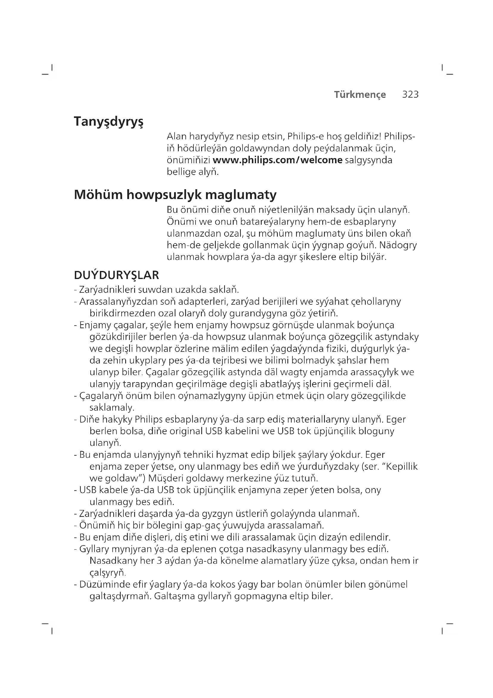 - Zarýadnikleri suwdan uzakda saklaň. - Arassalanyňyzdan soň adapterleri, zarýad berijileri we syýahat çehollaryny birikdirmezden ozal olaryň doly gurandygyna göz ýetiriň. - Enjamy çagalar, şeýle hem enjamy howpsuz görnüşde ulanmak boýunça gözükdirijiler berlen ýa-da howpsuz ulanmak boýunça gözegçilik astyndaky we degişli howplar özlerine mälim edilen ýagdaýynda fiziki, duýgurlyk ýa- da zehin ukyplary pes ýa-da tejribesi we bilimi bolmadyk şahslar hem ulanyp biler. Çagalar gözegçilik astynda däl wagty enjamda arassaçylyk we ulanyjy tarapyndan geçirilmäge degişli abatlaýyş işlerini geçirmeli däl. - Çagalaryň önüm bilen oýnamazlygyny üpjün etmek üçin olary gözegçilikde saklamaly. - Diňe hakyky Philips esbaplaryny ýa-da sarp ediş materiallaryny ulanyň. Eger berlen bolsa, diňe original USB kabelini we USB tok üpjünçilik bloguny ulanyň. - Bu enjamda ulanyjynyň tehniki hyzmat edip biljek şaýlary ýokdur. Eger enjama zeper ýetse, ony ulanmagy bes ediň we ýurduňyzdaky (ser. “Kepillik we goldaw”) Müşderi goldawy merkezine ýüz tutuň. - USB kabele ýa-da USB tok üpjünçilik enjamyna zeper ýeten bolsa, ony ulanmagy bes ediň. - Zarýadnikleri daşarda ýa-da gyzgyn üstleriň golaýynda ulanmaň. - Önümiň hiç bir bölegini gap-gaç ýuwujyda arassalamaň. - Bu enjam diňe dişleri, diş etini we dili arassalamak üçin dizaýn edilendir. - Gyllary mynjyran ýa-da eplenen çotga nasadkasyny ulanmagy bes ediň. Nasadkany her 3 aýdan ýa-da könelme alamatlary ýüze çyksa, ondan hem ir çalşyryň. - Düzüminde efir ýaglary ýa-da kokos ýagy bar bolan önümler bilen gönümel galtaşdyrmaň. Galtaşma gyllaryň gopmagyna eltip biler.324 Türkmençe