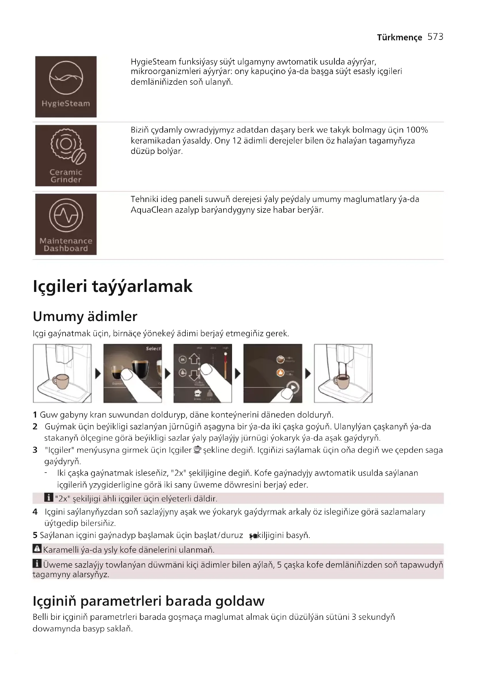 eger ýurduňyzda elýeterli bolsa, sesli dolandyryşy ulanmak üçin, Alexa öý enjamyňyza birigip bilersiňiz Bellik: Bu gaýnadyjy kofe bilen synag edildi. Ol seresaplylyk bilen arassalanylan hem bolsa, biraz kofe galyndysynyň galan bolmagy mümkin. Ýöne, biz kofe gaýnadyjynyň doly täzedigini kepillendirýäris. Size Xelsis SUPREMA (diňe SM8885, SM8889) bar bolsa, gaýnadyjyny açmak Gaýnadyjynyň arka tarapyndaky elektrik beriş geçirgijini basmak arkaly, gaýnadyjyny açyň. "Açmak" şekiljiginiň ekranda peýda bolmagy üçin dolandyryş paneliniň merkezine basyň. "Açmak" şekiljigine degip, dolandyryş panelindäki ädimleýin gözükdirijilere eýeriň. Gaýnadyjyny birinji gezek gurnanyňyzda birikdiriň we täzeläň, täzelenmeleri yzygiderli görnüşde elde barlap duruň.572 Türkmençe Size DELUXE (diňe SM8780, SM8782, SM8785) bar bolsa, gaýnadyjyny açmak Gaýnadyjynyň arka tarapyndaky elektrik beriş geçirgijini basmak arkaly, gaýnadyjyny açyň. "Açmak" şekiljigine degip, dolandyryş panelindäki ädimleýin gözükdirijilere eýeriň. Gaýnadyjyny birinji gezek gurnanyňyzda birikdiriň we täzeläň, täzelenmeleri yzygiderli görnüşde elde barlap duruň. Wi-Fi toruna birikmek Kofe gaýnadyjyňyzy 2.4 GHz 802.11 b/g/n home Wi-Fi toruna birikdiriň. Kofe gaýnadyjyňyzy öýdäki Wi-Fi toruňyza birikdirmeklik size ulanyjy tejribäňizi güýçlendirmäge mümkinçilik berýär. Kofe gaýnadyjysy bilen Wi-Fi routeriň birek-birege arabaglanyşyk çäklerinde bolmagyna üns beriň. Kofe gaýnadyjyňyzy Wi-Fi toruňyza birikdirmek üçin aşakdaky ädimlere eýeriň. 1 Sazlamalar şekiljigine degiň we Wi-Fi ;ekiljigini tapmak üçin çepden saga tarap gaýdyryň. 2 Wi-Fi şekiljigine degiň. 3 Gaýnadyjyňyzy Wi-Fi toruňyza birikdirmek üçin ekrandaky ädimlere eýeriň. Indi siz birikdirilen görnüşde tejribelige başlamak üçin taýýar. Sesli dolandyryş arkaly işledilen we öçürilen wagty hem-de belli bir wagt işjeň bolman öçürilen wagty, kofe gaýnadyjyňyz awtomatik ýuwup durlamak döwresini ýerine ýetirer. Kofe gaýnadyjynyň ýerleşýän daşky gurşawynyň howpsuzdygyny anyklaň. Ýörite funksiýalar Ýörite funksiýa Maksady BeanMaestro bilen kofe däneleriňiziň görnüşini we gowrulyşyny saýlap bilýärsiňiz. Soňra ol kofe däneleriňizden iň oňat netijäni almak üçin demleýiş sazlamalaryny awtomatik usulda laýyklaýar.573 Türkmençe HygieSteam funksiýasy süýt ulgamyny awtomatik usulda aýyrýar, mikroorganizmleri aýyrýar: ony kapuçino ýa-da başga süýt esasly içgileri demläniňizden soň ulanyň. Biziň çydamly owradyjymyz adatdan daşary berk we takyk bolmagy üçin 100% keramikadan ýasaldy. Ony 12 ädimli derejeler bilen öz halaýan tagamyňyza düzüp bolýar. Tehniki ideg paneli suwuň derejesi ýaly peýdaly umumy maglumatlary ýa-da AquaClean azalyp barýandygyny size habar berýär. Içgileri taýýarlamak Umumy ädimler Içgi gaýnatmak üçin, birnäçe ýönekeý ädimi berjaý etmegiňiz gerek. 1 Guw gabyny kran suwundan dolduryp, däne konteýnerini däneden dolduryň. 2 Guýmak üçin beýikligi sazlanýan jürnügiň aşagyna bir ýa-da iki çaşka goýuň. Ulanylýan çaşkanyň ýa-da stakanyň ölçegine görä beýikligi sazlar ýaly paýlaýjy jürnügi ýokaryk ýa-da aşak gaýdyryň. 3 "Içgiler" menýusyna girmek üçin Içgiler şekline degiň. Içgiňizi saýlamak üçin oňa degiň we çepden saga gaýdyryň.