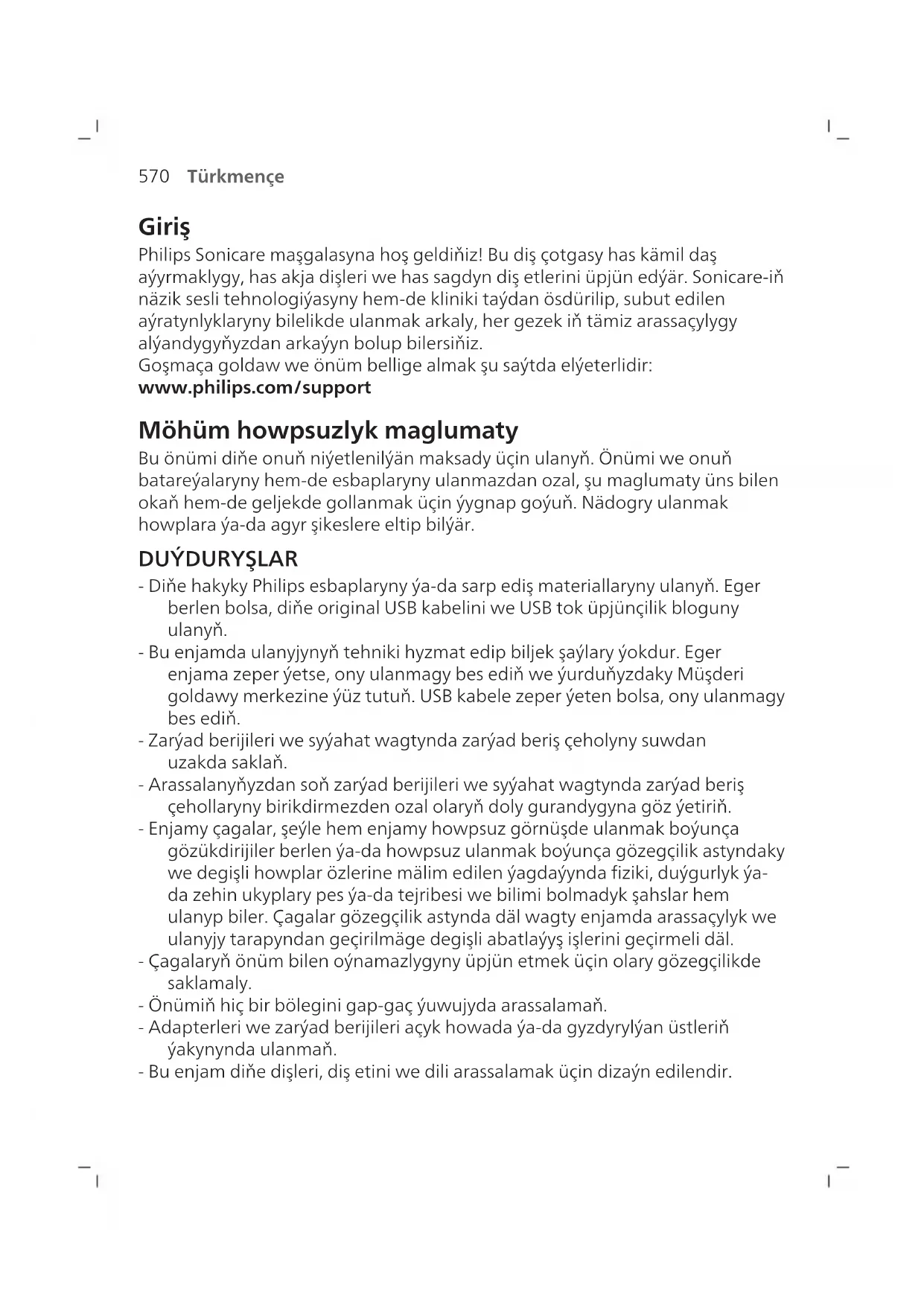 - Diňe hakyky Philips esbaplaryny ýa-da sarp ediş materiallaryny ulanyň. Eger berlen bolsa, diňe original USB kabelini we USB tok üpjünçilik bloguny ulanyň. - Bu enjamda ulanyjynyň tehniki hyzmat edip biljek şaýlary ýokdur. Eger enjama zeper ýetse, ony ulanmagy bes ediň we ýurduňyzdaky Müşderi goldawy merkezine ýüz tutuň. USB kabele zeper ýeten bolsa, ony ulanmagy bes ediň. - Zarýad berijileri we syýahat wagtynda zarýad beriş çeholyny suwdan uzakda saklaň. - Arassalanyňyzdan soň zarýad berijileri we syýahat wagtynda zarýad beriş çehollaryny birikdirmezden ozal olaryň doly gurandygyna göz ýetiriň. - Enjamy çagalar, şeýle hem enjamy howpsuz görnüşde ulanmak boýunça gözükdirijiler berlen ýa-da howpsuz ulanmak boýunça gözegçilik astyndaky we degişli howplar özlerine mälim edilen ýagdaýynda fiziki, duýgurlyk ýa- da zehin ukyplary pes ýa-da tejribesi we bilimi bolmadyk şahslar hem ulanyp biler. Çagalar gözegçilik astynda däl wagty enjamda arassaçylyk we ulanyjy tarapyndan geçirilmäge degişli abatlaýyş işlerini geçirmeli däl. - Çagalaryň önüm bilen oýnamazlygyny üpjün etmek üçin olary gözegçilikde saklamaly. - Önümiň hiç bir bölegini gap-gaç ýuwujyda arassalamaň. - Adapterleri we zarýad berijileri açyk howada ýa-da gyzdyrylýan üstleriň ýakynynda ulanmaň. - Bu enjam diňe dişleri, diş etini we dili arassalamak üçin dizaýn edilendir.571 Türkmençe - Gyllary mynjyran ýa-da eplenen çotga nasadkasyny ulanmagy bes ediň. Nasadkany her 3 aýdan ýa-da könelme alamatlary ýüze çyksa, ondan hem ir çalşyryň. - Düzüminde efir ýaglary ýa-da kokos ýagy bar bolan önümler bilen gönümel galtaşdyrmaň. Galtaşma gyllaryň gopmagyna eltip biler. - Ulanmagyň maksimum beýikligi 4500 metrdir.