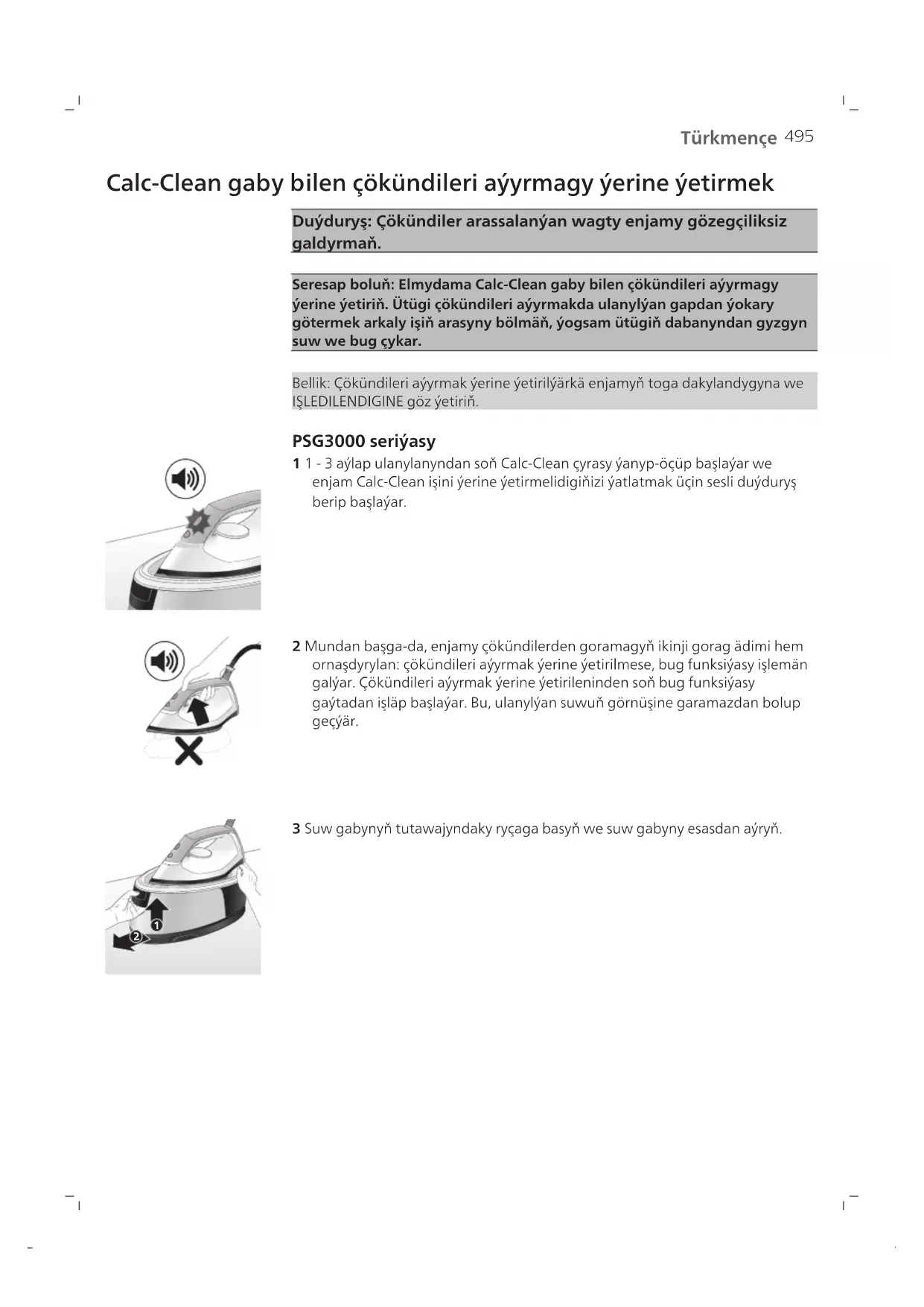 2 3 sekuntlap güýçli bug çykmagy üçin bug goýberiji düwmäni çaltlyk bilen iki gezek basyň. Awto-öçürmek ~15 min 1 Enjam 15 minutdan köp wagtlap ulanylmasa, ütügiň taýýardygyny görkezýän çyra ýanyp-öçüp başlaýar we ütük sowap başlaýar.494 Türkmençe OFF ~10 min 2 Şondan soň 10 minutlap enjama degilmese, ol awtomatik usulda öçýär. Duýduryş: Elektrik toguna birikdirilen enjamy hiç haçan gözegçiliksiz galdyrmaň. Ulanyp bolanyňyzdan soň elmydama enjamy tokdan aýryň. Arassalamak we abatlamak Smart Calc-Clean ulgamy Kesmegi aýyrmagyň we arassaçylygyň yzygiderli ýerine ýetirilmegini üpjün etmeküçin enjamyňyz Smart Calc-Clean ulgamy bilen işlenip düzülen. Bu enjamdangüýçli buguň öndürilmegini üpjün etmäge we wagtyň geçmegi bilen ütügiňdabanyndan hapalaryň hem-de tegmilleriň çykmagynyň öňüni almaga ýardamberýär. Arassaçylyk işiniň ýerine ýetirilmegini üpjün etmek maksady bilen enjambelli aralyklar bilen ulanyja ýatladýar.495 Türkmençe Calc-Clean gaby bilen çökündileri aýyrmagy ýerine ýetirmek Duýduryş: Çökündiler arassalanýan wagty enjamy gözegçiliksiz galdyrmaň. Seresap boluň: Elmydama Calc-Clean gaby bilen çökündileri aýyrmagy ýerine ýetiriň. Ütügi çökündileri aýyrmakda ulanylýan gapdan ýokary götermek arkaly işiň arasyny bölmäň, ýogsam ütügiň dabanyndan gyzgyn suw we bug çykar. Bellik: Çökündileri aýyrmak ýerine ýetirilýärkä enjamyň toga dakylandygyna we IŞLEDILENDIGINE göz ýetiriň. PSG3000 seriýasy 1 1 - 3 aýlap ulanylanyndan soň Calc-Clean çyrasy ýanyp-öçüp başlaýar we enjam Calc-Clean işini ýerine ýetirmelidigiňizi ýatlatmak üçin sesli duýduryş berip başlaýar. 2 Mundan başga-da, enjamy çökündilerden goramagyň ikinji gorag ädimi hem ornaşdyrylan: çökündileri aýyrmak ýerine ýetirilmese, bug funksiýasy işlemän galýar. Çökündileri aýyrmak ýerine ýetirileninden soň bug funksiýasy gaýtadan işläp başlaýar. Bu, ulanylýan suwuň görnüşine garamazdan bolup geçýär.