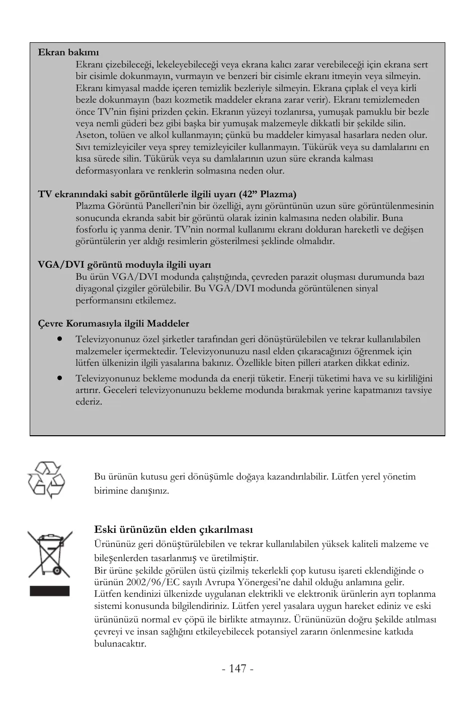 N'utilisez aucun produit nettoyant liquide ou en aérosol. Essuyez traces de salive et gouttes d’eau dès que possible. Un contact prolongé avec l’écran est la cause de déformations et de décolorations. Avertissement relatif aux images fixes sur l’écran TV (Plasma 42”) L’une des caractéristiques des écrans d’affichage au plasma est que l’affichage prolongé de la même image peut provoquer une image rémanente, affichée en permanence à l’écran. L’utilisation normale de la TV devrait impliquer l’affichage d’images en mouvement constant voire d’images constamment changeantes et emplissant l’écran. Avertissement concernant le mode d’affichage VGA/DVI. Ce produit fonctionnant en mode VGA/DVI, certaines diagonales peuvent s’afficher en cas d’interférences environnementales. Les performances du signal informatique affiché en mode VGA/DVI ne devraient pas s'en voir affectées. Environnemental • Votre téléviseur contient des matériaux susceptibles d’être recyclés et réutilisés par des sociétés spécialisées. Veuillez vous renseigner sur les réglementations locales relatives à la mise au rebut de votre ancien téléviseur. Prêtez une attention toute particulière à la mise au rebut des batteries ou piles. • Votre téléviseur consomme de l’énergie en mode Stand-by (Veille). La consommation d’énergie contribue à la pollution de l’air et de l’eau. Nous vous conseillons de couper votre téléviseur la nuit au lieu de le laisser en mode Stand-by.