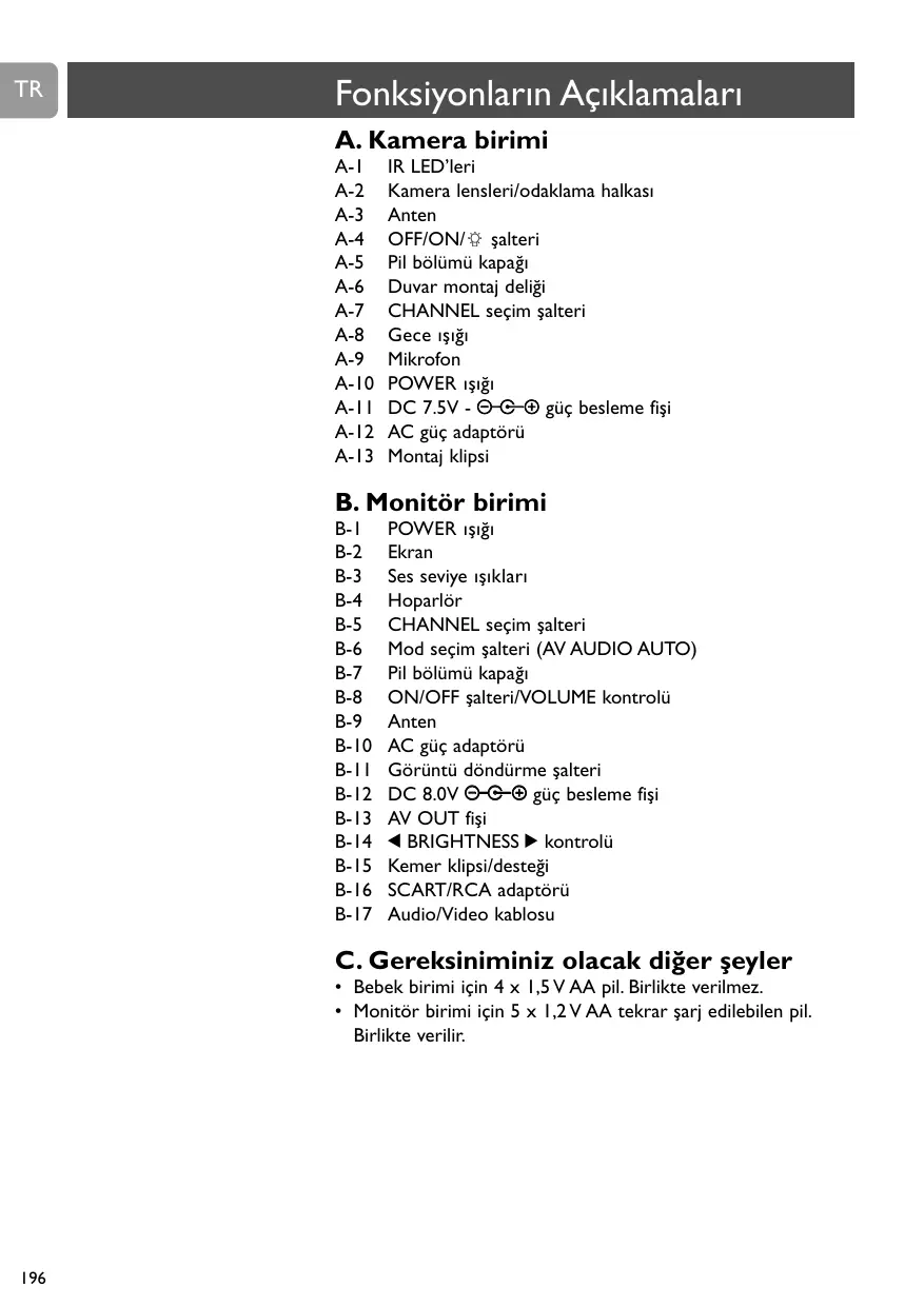 B-1 B-2 Tapa de compartimiento de pilas Interruptor de ON/OFF/Control de VOLUME Antena Adaptador de corriente de CA Interruptor de inversión de imagen Conector de suministro de 8,0 VCC -<+ Conector de salida AV 1 BRIGHTNESS 2 Clip/soporte de cinturón Adaptador SCART/RCA Cable de audio/vídeo