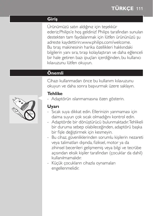 Garantía y servicio Si necesita información o si tiene algún problema, visite la página Web de Philips en www.philips.com, o póngase en contacto con el Servicio de Atención al Cliente de Philips en su país (hallará el número de teléfono en el folleto de la garantía mundial). Si no hay Servicio de Atención al Cliente de Philips en su país, diríjase a su distribuidor local Philips. Restricciones de la garantía Los cabezales de afeitado (cuchillas y protectores) no están cubiertos por las condiciones de la garantía internacional debido a que están sujetos a desgaste. Guía de resolución de problemas 1 La afeitadora no afeita tan bien como antes. - Puede que los cabezales estén gastados o deteriorados. Sustitúyalos (consulte el capítulo “Sustitución”). - Puede que haya pelos largos obstruyendo los cabezales de afeitado. Limpie las cuchillas y protectores con el cepillo que se suministra Veuillez lire ce mode d’emploi, qui contient des informations sur les fonctionnalités remarquables de ce rasoir, ainsi que des conseils pour un rasage plus facile et plus agréable. Important Lisez attentivement ce mode d’emploi avant d’utiliser l’appareil et conservez-le pour un usage ultérieur. Danger - Veillez à ce que l’adaptateur ne soit pas en contact avec de l’eau. Avertissement - Veillez à ce que l’eau ne soit pas trop chaude pour ne pas vous brûler. - L’adaptateur contient un transformateur. N’essayez pas de remplacer la fiche de l’adaptateur pour éviter tout accident. - Cet appareil n’est pas destiné à être utilisé par des personnes (notamment des enfants) dont les capacités physiques, sensorielles ou intellectuelles sont réduites, ou par des personnes manquant d’expérience ou de connaissances, à moins que celles-ci ne soient sous surveillance ou qu’elles aient reçu des instructions quant à l’utilisation de l’appareil par une personne responsable de leur sécurité. - Veillez à ce que les enfants ne puissent pas jouer avec l’appareil.