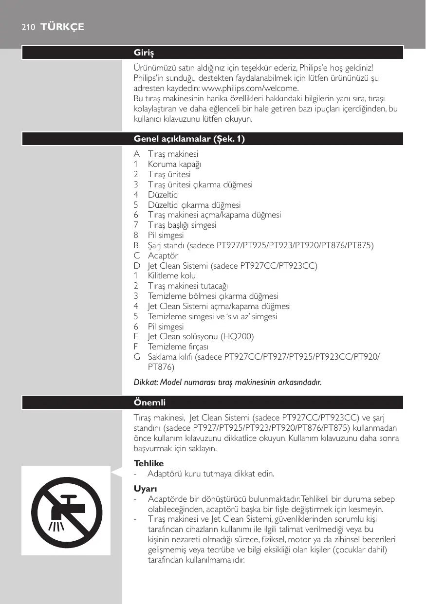 Tıraş makinesi Koruma kapağı Tıraş ünitesi Tıraş ünitesi çıkarma düğmesi Düzeltici Düzeltici çıkarma düğmesi Tıraş makinesi açma/kapama düğmesi Tıraş başlığı simgesi Pil simgesi Şarj standı (sadece PT927/PT925/PT923/PT920/PT876/PT875) Adaptör Jet Clean Sistemi (sadece PT927CC/PT923CC) Kilitleme kolu Tıraş makinesi tutacağı Temizleme bölmesi çıkarma düğmesi Jet Clean Sistemi açma/kapama düğmesi Temizleme simgesi ve ‘sıvı az’ simgesi Pil simgesi Jet Clean solüsyonu (HQ200) Temizleme fırçası Saklama kılıfı (sadece PT927CC/PT927/PT925/PT923CC/PT920/ PT876) Dikkat: Model numarası tıraş makinesinin arkasındadır. Önemli Tıraş makinesi, Jet Clean Sistemi (sadece PT927CC/PT923CC) ve şarj standını (sadece PT927/PT925/PT923/PT920/PT876/PT875) kullanmadan önce kullanım kılavuzunu dikkatlice okuyun. Kullanım kılavuzunu daha sonra başvurmak için saklayın. Tehlike -- Adaptörü kuru tutmaya dikkat edin. Uyarı -- Adaptörde bir dönüştürücü bulunmaktadır. Tehlikeli bir duruma sebep olabileceğinden, adaptörü başka bir fişle değiştirmek için kesmeyin. -- Tıraş makinesi ve Jet Clean Sistemi, güvenliklerinden sorumlu kişi tarafından cihazların kullanımı ile ilgili talimat verilmediği veya bu kişinin nezareti olmadığı sürece, fiziksel, motor ya da zihinsel becerileri gelişmemiş veya tecrübe ve bilgi eksikliği olan kişiler (çocuklar dahil) tarafından kullanılmamalıdır. Türkçe 211 -- Çocukların tıraş makinesi ve Jet Clean Sistemi ile oynamasına izin vermeyin. -- Tıraş makinesini musluk altında yıkamadan önce mutlaka prizden çekin. Dikkat -- Tıraş makinesini asla suya batırmayın. -- Jet Clean Sistemini veya şarj standını kesinlikle suya batırmayın ve musluk altında yıkamayın. -- Tıraş makinesini banyo ya da duş yaparken kullanmayın. -- Tıraş makinesini durulamak için asla 80°C’den sıcak su kullanmayın. -- Sıcak suya dikkat edin. Ellerinizin yanmaması için daima suyun çok sıcak olmadığını kontrol edin. -- Tıraş makinesi, Jet Clean Sistemi, şarj standı ve diğer aksesuarlar bulaşık makinesinde yıkanmaz. -- Tıraş makinesini yıkadığınızda, alt kısımda bulunan fiş soketinden içeri su sızabilir. Bu durum normaldir ve cihazın tüm elektronik parçaları su geçirmez bir güç ünitesi ile kaplı olduğu için tehlikeli değildir. -- Yaralanmaya yol açabileceğinden, hasarlıysa tıraş makinesini, Jet Clean Sistemini, adaptörü, şarj standını veya herhangi bir parçasını kullanmayın. Hasarlı adaptörü, şarj standını veya parçayı mutlaka orijinal bir başkasıyla değiştirin. -- Tıraş makinesi ve Jet Clean Sistemi, 10°C - 35°C arasındaki sıcaklıklarda kullanılmalı, şarj edilmeli ve saklanmalıdır. -- Tıraş makinesini ve Jet Clean Sistemini her zaman sıvı geçirmeyen bir yüzeyde bırakın ve kullanın. -- Sadece cihazla birlikte verilen adaptörü, şarj standını ve aksesuarları kullanın. -- Hasar görmesini ve tıraş başlıklarında kir birikmesini önlemek için tıraş makinesinin koruyucu kapağını her zaman takın. -- Jet Clean Sistemini yalnızca orijinal Jet Clean solüsyonu (HQ200) ile kullanın. -- Sızıntıyı önlemek için Jet Clean Sistemini daima sabit, düzgün ve yatay bir zemine yerleştirin. -- Jet Clean Sistemi kullanıma hazır olduğunda, sızıntıyı önlemek için hareket ettirmeyin. -- Jet Clean Sistemi, tıraş makinenizi tamamen temizler fakat dezenfekte etmez, bu nedenle tıraş makinesini başkalarıyla paylaşmayın. -- 15 günde bir, Jet Clean Sisteminin temizleme bölmesini boşaltın ve sıcak musluk suyuyla yıkayarak temizleyin. -- Tıraş makinesi ve Jet Clean Sistemi dikkate değer sıcaklık, basınç ya da nem değişikliklerine maruz kaldığında, kullanmadan önce 30 dakika boyunca ortam koşullarına uygun hale gelmesini bekleyin.