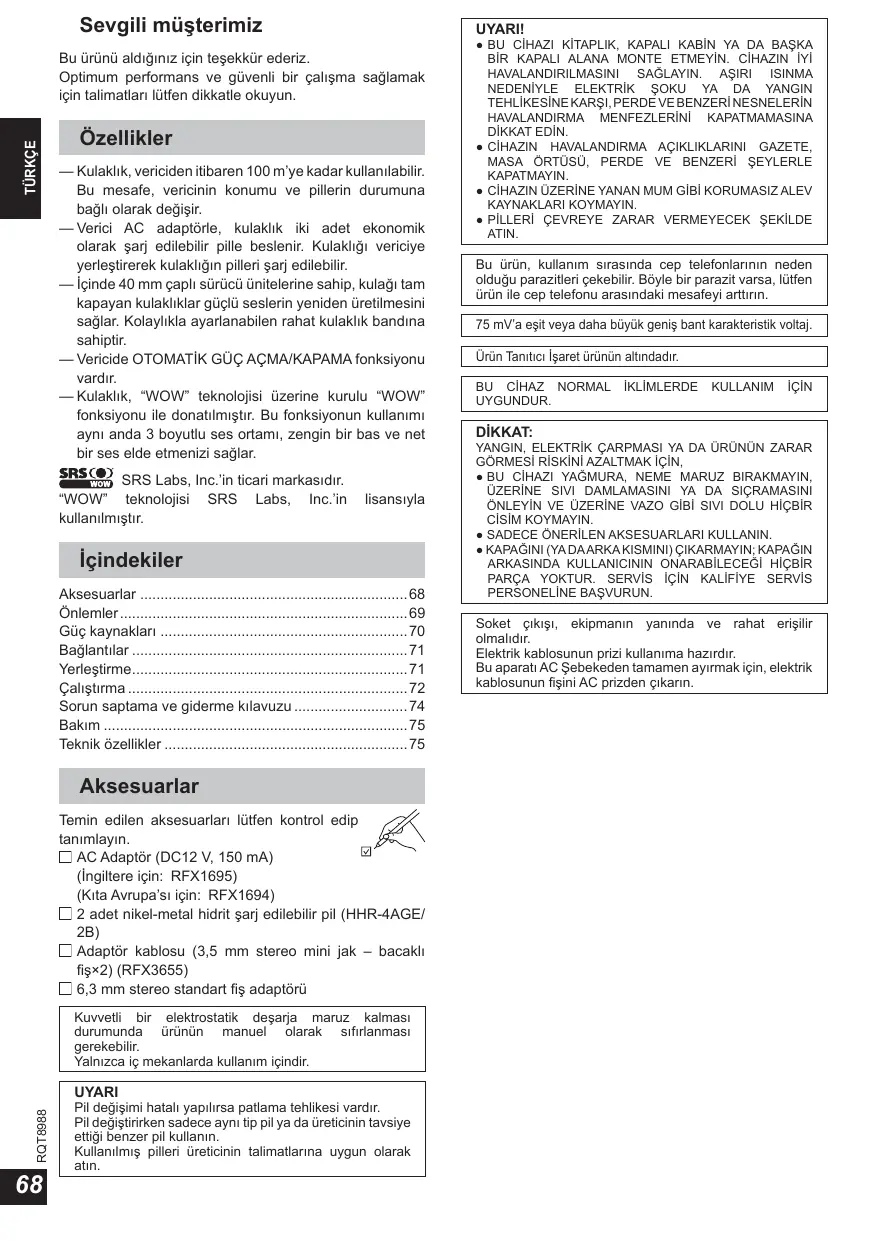 - Bu ürünü aldığınız için teşekkür ederiz. Optimum performans ve güvenli bir çalışma sağlamak için talimatları lütfen dikkatle okuyun. Özellikler — Kulaklık, vericiden itibaren 100 m’ye kadar kullanılabilir. Bu mesafe, vericinin konumu ve pillerin durumuna bağlı olarak değişir. — Verici AC adaptörle, kulaklık iki adet ekonomik olarak şarj edilebilir pille beslenir. Kulaklığı vericiye yerleştirerek kulaklığın pilleri şarj edilebilir. — İçinde 40 mm çaplı sürücü ünitelerine sahip, kulağı tam kapayan kulaklıklar güçlü seslerin yeniden üretilmesini sağlar. Kolaylıkla ayarlanabilen rahat kulaklık bandına sahiptir. — Vericide OTOMATİK GÜÇ AÇMA/KAPAMA fonksiyonu vardır. — Kulaklık, “WOW” teknolojisi üzerine kurulu “WOW” fonksiyonu ile donatılmıştır. Bu fonksiyonun kullanımı aynı anda 3 boyutlu ses ortamı, zengin bir bas ve net bir ses elde etmenizi sağlar. SRS Labs, Inc.’in ticari markasıdır. “WOW” teknolojisi SRS Labs, Inc.’in kullanılmıştır. lisansıyla İçindekiler Aksesuarlar p. 68