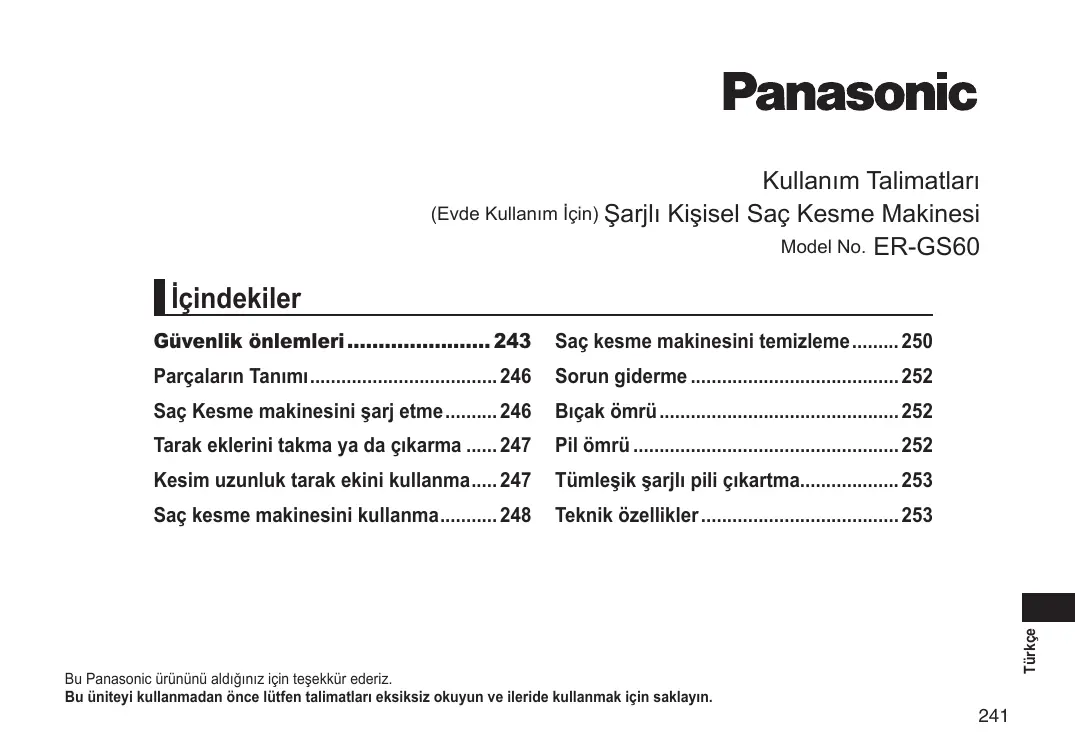 Téléchargez la notice de votre Saç kesme makinesi au format PDF gratuitement ! Retrouvez votre notice ER-GS60 - PANASONIC et reprennez votre appareil électronique en main. Sur cette page sont publiés tous les documents nécessaires à l'utilisation de votre appareil ER-GS60 de la marque PANASONIC.