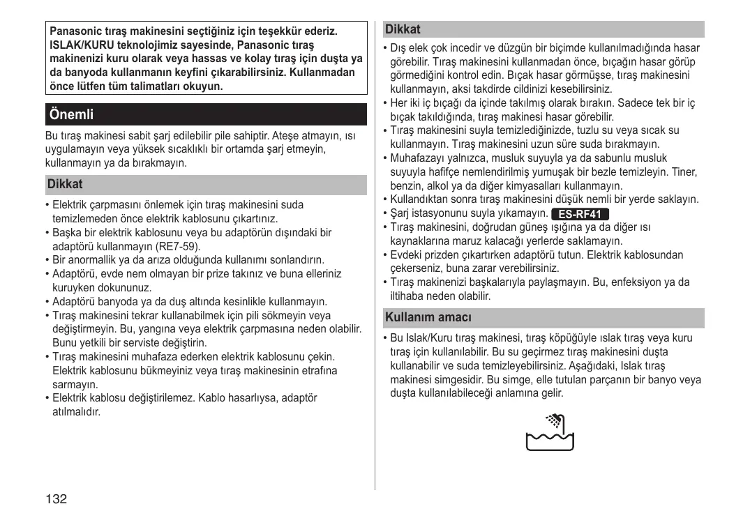 • En az üç hafta boyunca ıslak köpük tıraşıyla tıraş olunuz ve farkı görünüz. Panasonic Islak/Kuru tıraş makinesine alışmanız biraz zaman alır, çünkü cildinizin ve sakalınızın kendisini yeni herhangi bir tıraş yöntemine göre ayarlaması yaklaşık bir ay sürer. • Tıraş makinesi ana gövdesi, “IPX7” koruma derecesine, adaptör de “IPX4” koruma derecesine uygun olarak su geçirmezdir. Notlar • Bu ürün sadece ev kullanımı için tasarlanmıştır. • Bu cihaz, güvenliklerinden sorumlu bir kişi tarafından cihazın kullanımıyla ilgili denetim veya talimatlar sunulmadığı sürece, (çocuklar da dahil) fiziksel, işitsel veya zihinsel yetenekleri sınırlı olan ya da deneyim ve bilgisi bulunmayan kişiler tarafından kullanılmaya uygun değildir. Cihazla oynamadıklarından emin olmak için, çocukların denetim altında bulundurulması gerekir.