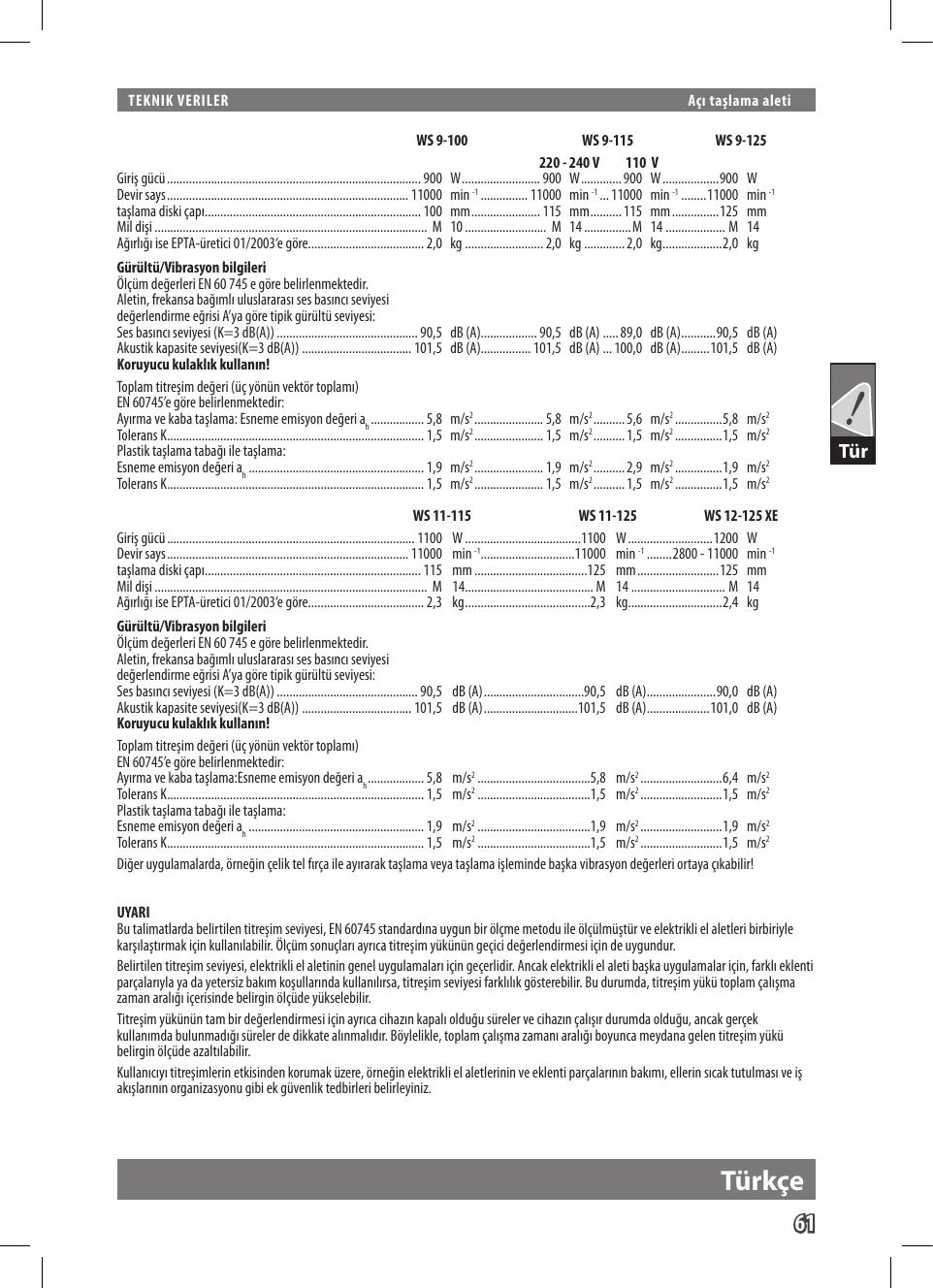 110 V Giriş gücü.................................................................................. 900 W.......................... 900 W.............. 900 W...................900 W Devir says.............................................................................. 11000 min -1................ 11000 min -1.... 11000 min -1.........11000 min -1 taşlama diski çapı...................................................................... 100 mm....................... 115 mm........... 115 mm................125 mm Mil dişi........................................................................................ M 10........................... M 14................M 14.................... M 14 Ağırlığı ise EPTA-üretici 01/2003‘e göre...................................... 2,0 kg.......................... 2,0 kg.............. 2,0 kg....................2,0 kg Gürültü/Vibrasyon bilgileri Ölçüm değerleri EN 60 745 e göre belirlenmektedir. Aletin, frekansa bağımlı uluslararası ses basıncı seviyesi değerlendirme eğrisi A’ya göre tipik gürültü seviyesi: Ses basıncı seviyesi (K=3 dB(A)).............................................. 90,5 dB (A).................. 90,5 dB (A)...... 89,0 dB (A)............90,5 dB (A) Akustik kapasite seviyesi(K=3 dB(A)).................................... 101,5 dB (A)................ 101,5 dB (A).... 100,0 dB (A)..........101,5 dB (A) Koruyucu kulaklık kullanın! Toplam titreşim değeri (üç yönün vektör toplamı) EN 60745’e göre belirlenmektedir: Ayırma ve kaba taşlama: Esneme emisyon değeri ah.................. 5,8 m/s2....................... 5,8 m/s2........... 5,6 m/s2................5,8 m/s2 Tolerans K................................................................................... 1,5 m/s2....................... 1,5 m/s2........... 1,5 m/s2................1,5 m/s2 Plastik taşlama tabağı ile taşlama: Esneme emisyon değeri ah......................................................... 1,9 m/s2....................... 1,9 m/s2........... 2,9 m/s2................1,9 m/s2 Tolerans K................................................................................... 1,5 m/s2....................... 1,5 m/s2........... 1,5 m/s2................1,5 m/s2 Tür WS 11-115 WS 11-125 WS 12-125 XE Giriş gücü................................................................................ 1100 W......................................1100 W............................1200 W Devir says.............................................................................. 11000 min -1..............................11000 min -1.........2800 - 11000 min -1 taşlama diski çapı...................................................................... 115 mm.....................................125 mm...........................125 mm Mil dişi........................................................................................ M 14.......................................... M 14............................... M 14 Ağırlığı ise EPTA-üretici 01/2003‘e göre...................................... 2,3 kg.........................................2,3 kg...............................2,4 kg Gürültü/Vibrasyon bilgileri Ölçüm değerleri EN 60 745 e göre belirlenmektedir. Aletin, frekansa bağımlı uluslararası ses basıncı seviyesi değerlendirme eğrisi A’ya göre tipik gürültü seviyesi: Ses basıncı seviyesi (K=3 dB(A)).............................................. 90,5 dB (A).................................90,5 dB (A).......................90,0 dB (A) Akustik kapasite seviyesi(K=3 dB(A)).................................... 101,5 dB (A)...............................101,5 dB (A).....................101,0 dB (A) Koruyucu kulaklık kullanın! Toplam titreşim değeri (üç yönün vektör toplamı) EN 60745’e göre belirlenmektedir: Ayırma ve kaba taşlama:Esneme emisyon değeri ah. ................. 5,8 m/s2.....................................5,8 m/s2...........................6,4 m/s2 Tolerans K................................................................................... 1,5 m/s2.....................................1,5 m/s2...........................1,5 m/s2 Plastik taşlama tabağı ile taşlama: Esneme emisyon değeri ah......................................................... 1,9 m/s2.....................................1,9 m/s2...........................1,9 m/s2 Tolerans K................................................................................... 1,5 m/s2.....................................1,5 m/s2...........................1,5 m/s2 Diğer uygulamalarda, örneğin çelik tel fırça ile ayırarak taşlama veya taşlama işleminde başka vibrasyon değerleri ortaya çıkabilir! UYARI Bu talimatlarda belirtilen titreşim seviyesi, EN 60745 standardına uygun bir ölçme metodu ile ölçülmüştür ve elektrikli el aletleri birbiriyle karşılaştırmak için kullanılabilir. Ölçüm sonuçları ayrıca titreşim yükünün geçici değerlendirmesi için de uygundur. Belirtilen titreşim seviyesi, elektrikli el aletinin genel uygulamaları için geçerlidir. Ancak elektrikli el aleti başka uygulamalar için, farklı eklenti parçalarıyla ya da yetersiz bakım koşullarında kullanılırsa, titreşim seviyesi farklılık gösterebilir. Bu durumda, titreşim yükü toplam çalışma zaman aralığı içerisinde belirgin ölçüde yükselebilir. Titreşim yükünün tam bir değerlendirmesi için ayrıca cihazın kapalı olduğu süreler ve cihazın çalışır durumda olduğu, ancak gerçek kullanımda bulunmadığı süreler de dikkate alınmalıdır. Böylelikle, toplam çalışma zamanı aralığı boyunca meydana gelen titreşim yükü belirgin ölçüde azaltılabilir. Kullanıcıyı titreşimlerin etkisinden korumak üzere, örneğin elektrikli el aletlerinin ve eklenti parçalarının bakımı, ellerin sıcak tutulması ve iş akışlarının organizasyonu gibi ek güvenlik tedbirleri belirleyiniz. Türkçe