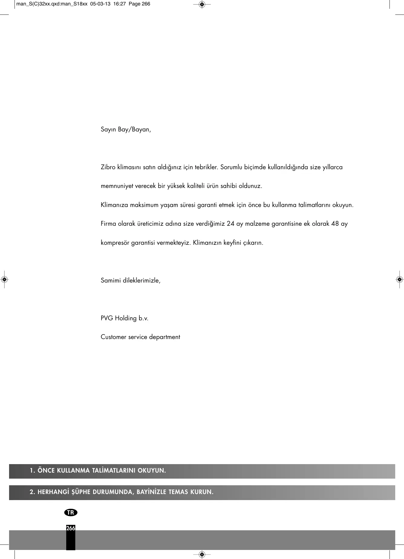Zibro klimas›n› sat›n ald›¤›n›z için tebrikler. Sorumlu biçimde kullan›ld›¤›nda size y›llarca memnuniyet verecek bir yüksek kaliteli ürün sahibi oldunuz. Kliman›za maksimum yaflam süresi garanti etmek için önce bu kullanma talimatlar›n› okuyun. Firma olarak üreticimiz adına size verdiğimiz 24 ay malzeme garantisine ek olarak 48 ay kompresör garantisi vermekteyiz. Kliman›z›n keyfini ç›kar›n.