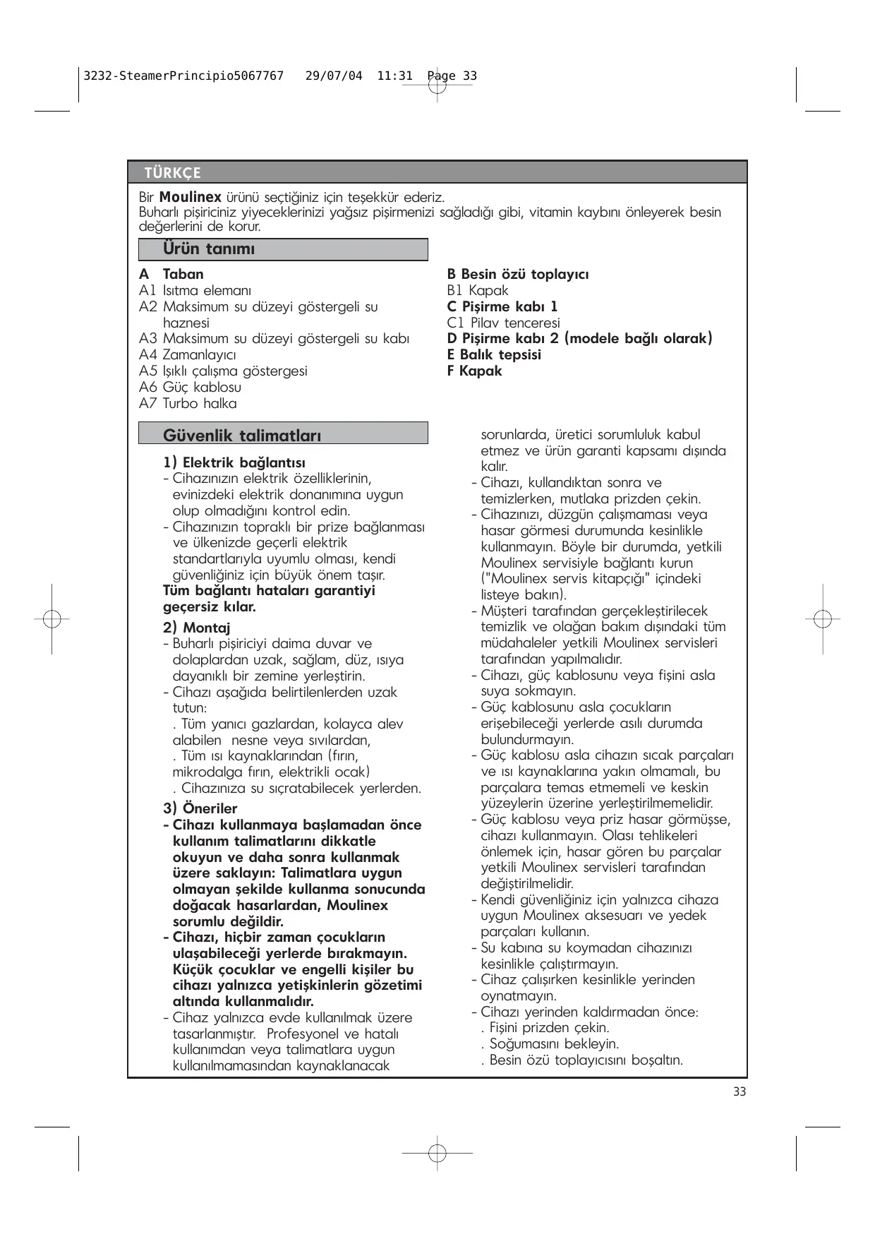 Débranchez l’appareil dès que vous cessez de l’utiliser et lorsque vous le nettoyez. N’utilisez pas votre appareil s’il ne fonctionne pas correctement ou s’il a été endommagé. Dans ce cas, adressez-vous à un centre service agréé Moulinex (voir liste dans le livret “Moulinex service“). Toute intervention autre que le nettoyage et l’entretien usuel par le client doit être effectuée par un centre service agréé Moulinex. Ne mettez pas l’appareil, le câble d’alimentation ou la fiche dans l’eau ou tout autre liquide. Ne laissez pas pendre le câble d’alimentation à portée de mains des enfants. Le câble d’alimentation ne doit jamais être à proximité ou en contact avec les parties chaudes de votre appareil, près d’une source de chaleur ou sur un angle vif. Si le câble d’alimentation ou la fiche sont endommagés, n’utilisez pas l’appareil. Afin d’éviter tout danger, faites-les obligatoirement remplacer par un centre service agréé Moulinex. Pour votre sécurité, n’utilisez que des accessoires et des pièces détachées Moulinex adaptés à votre appareil. Ne faites pas fonctionner votre appareil sans eau dans le réservoir. Ne déplacez pas l’appareil en cours de cuisson. 3