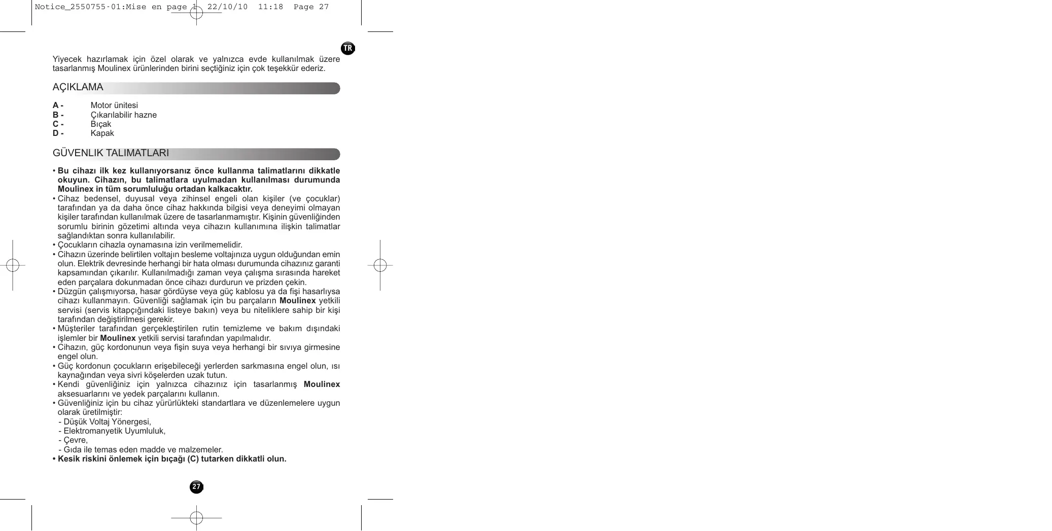 GÜVENLIK TALIMATLARI • Bu cihazı ilk kez kullanıyorsanız önce kullanma talimatlarını dikkatle okuyun. Cihazın, bu talimatlara uyulmadan kullanılması durumunda Moulinex in tüm sorumluluğu ortadan kalkacaktır. • Cihaz bedensel, duyusal veya zihinsel engeli olan kişiler (ve çocuklar) tarafından ya da daha önce cihaz hakkında bilgisi veya deneyimi olmayan kişiler tarafından kullanılmak üzere de tasarlanmamıştır. Kişinin güvenliğinden sorumlu birinin gözetimi altında veya cihazın kullanımına ilişkin talimatlar sağlandıktan sonra kullanılabilir. • Çocukların cihazla oynamasına izin verilmemelidir. • Cihazın üzerinde belirtilen voltajın besleme voltajınıza uygun olduğundan emin olun. Elektrik devresinde herhangi bir hata olması durumunda cihazınız garanti kapsamından çıkarılır. Kullanılmadığı zaman veya çalışma sırasında hareket eden parçalara dokunmadan önce cihazı durdurun ve prizden çekin. • Düzgün çalışmıyorsa, hasar gördüyse veya güç kablosu ya da fişi hasarlıysa cihazı kullanmayın. Güvenliği sağlamak için bu parçaların Moulinex yetkili servisi (servis kitapçığındaki listeye bakın) veya bu niteliklere sahip bir kişi tarafından değiştirilmesi gerekir. • Müşteriler tarafından gerçekleştirilen rutin temizleme ve bakım dışındaki işlemler bir Moulinex yetkili servisi tarafından yapılmalıdır. • Cihazın, güç kordonunun veya fişin suya veya herhangi bir sıvıya girmesine engel olun. • Güç kordonun çocukların erişebileceği yerlerden sarkmasına engel olun, ısı kaynağından veya sivri köşelerden uzak tutun. • Kendi güvenliğiniz için yalnızca cihazınız için tasarlanmış Moulinex aksesuarlarını ve yedek parçalarını kullanın. • Güvenliğiniz için bu cihaz yürürlükteki standartlara ve düzenlemelere uygun olarak üretilmiştir: - Düşük Voltaj Yönergesi, - Elektromanyetik Uyumluluk, - Çevre, - Gıda ile temas eden madde ve malzemeler. • Kesik riskini önlemek için bıçağı (C) tutarken dikkatli olun. 27