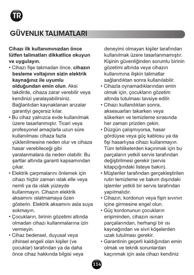 TR GÜVENLIK TALIMATLARI Cihazı ilk kullanımınızdan önce lütfen talimatları dikkatlice okuyun ve uygulayın. • Cihazı fişe takmadan önce, cihazın besleme voltajının sizin elektrik kaynağınız ile uyumlu olduğundan emin olun. Aksi takdirde, cihaza zarar verebilir veya kendinizi yaralayabilirsiniz. Bağlantıdan kaynaklanan arızalar garantiyi geçersiz kılar. • Bu cihaz yalnızca evde kullanılmak üzere tasarlanmıştır. Ticari veya profesyonel amaçlarla uzun süre kullanılması cihaza fazla yüklenilmesine neden olur ve cihaza hasar verebileceği gibi yaralanmalara da neden olabilir. Bu şartlar altında garanti kapsamından çıkar. • Elektrik çarpmalarını önlemek için cihazı hiçbir zaman ıslak elle veya nemli ya da ıslak yüzeyde kullanmayın. Cihazın elektrik aksamını ıslatmamaya özen gösterin. Elektrik aksamını asla suya sokmayın. • Çocukların, birinin gözetimi altında olmadan cihazı kullanmalarına izin vermeyin. • Cihaz bedensel, duyusal veya zihinsel engeli olan kişiler (ve çocuklar) tarafından ya da daha önce cihaz hakkında bilgisi veya