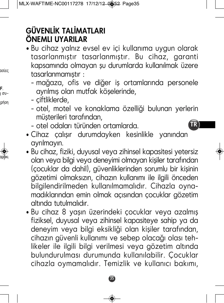 GÜVENLİK TALİMATLARI ÖNEMLI UYARILAR • Bu cihaz yalnız evsel ev içi kullanıma uygun olarak tasarlanmıştır tasarlanmıştır. Bu cihaz, garanti kapsamında olmayan şu durumlarda kullanılmak üzere tasarlanmamıştır : - mağaza, ofis ve diğer iş ortamlarında personele ayrılmış olan mutfak köşelerinde, - çiftliklerde, - otel, motel ve konaklama özelliği bulunan yerlerin müşterileri tarafından, TR - otel odaları türünden ortamlarda. • Cihaz çalışır durumdayken kesinlikle yanından ayrılmayın. • Bu cihaz, fiziki, duyusal veya zihinsel kapasitesi yetersiz olan veya bilgi veya deneyimi olmayan kişiler tarafından (çocuklar da dahil), güvenliklerinden sorumlu bir kişinin gözetimi olmaksızın, cihazın kullanımı ile ilgili önceden bilgilendirilmeden kullanılmamalıdır. Cihazla oynamadıklarından emin olmak açısından çocuklar gözetim altında tutulmalıdır. • Bu cihaz 8 yaşın üzerindeki çocuklar veya azalmış fiziksel, duyusal veya zihinsel kapasiteye sahip ya da deneyim veya bilgi eksikliği olan kişiler tarafından, cihazın güvenli kullanımı ve sebep olacağı olası tehlikeler ile ilgili bilgi verilmesi veya gözetim altında bulundurulması durumunda kullanılabilir. Çocuklar cihazla oymamalıdır. Temizlik ve kullanıcı bakımı, 35