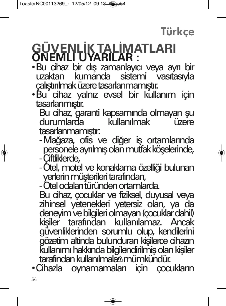- Bu cihaz yalnız evsel bir kullanım için tasarlanmıştır. Bu cihaz, garanti kapsamında olmayan şu durumlarda kullanılmak üzere tasarlanmamıştır: - Mağaza, ofis ve diğer iş ortamlarında personele ayrılmış olan mutfak köşelerinde, - Çiftliklerde, - Otel, motel ve konaklama özelliği bulunan yerlerin müşterileri tarafından, - Otel odaları türünden ortamlarda. Bu cihaz, çocuklar ve fiziksel, duyusal veya zihinsel yetenekleri yetersiz olan, ya da deneyim ve bilgileri olmayan (çocuklar dahil) kişiler tarafndan kullanlamaz. Ancak güvenliklerinden sorumlu olup, kendilerini gözetim altinda bulunduran kişilerce cihazn kullanm hakknda bilgilendirilmiş olan kişiler tarafndan kullanlmalar mümkündür.