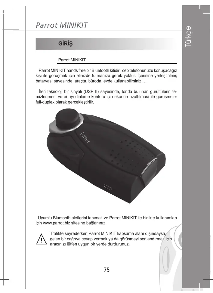 Connectez-vous sur www.parrot.biz pour connaître l’ensemble des appareils Bluetooth compatibles et comment les utiliser avec le Parrot MINIKIT. Si pendant votre conduite le Parrot MINIKIT est hors de votre portée, veuillez arrêter votre véhicule à un emplacement approprié pour décrocher ou raccrocher un appel.
