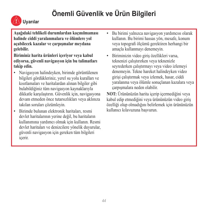• Utilice esta unidad sólo como ayuda para la navegación. No intente utilizar la unidad para cualquier otro propósito que requiera mediciones precisas de la dirección, la distancia, la localización o la topografía. • Si su unidad dispone de funciones de entrada de vídeo, no intente ponerlo en funcionamiento mientras maneja la embarcación. El uso o la visualización de entrada de vídeo mientras se mueve la embarcación podría provocar un accidente o colisión que cause la muerte, lesiones graves o daños materiales. NOTA: consulte el manual del usuario del producto para determinar si éste contiene o acepta mapas, o si tiene funciones de entrada de vídeo.