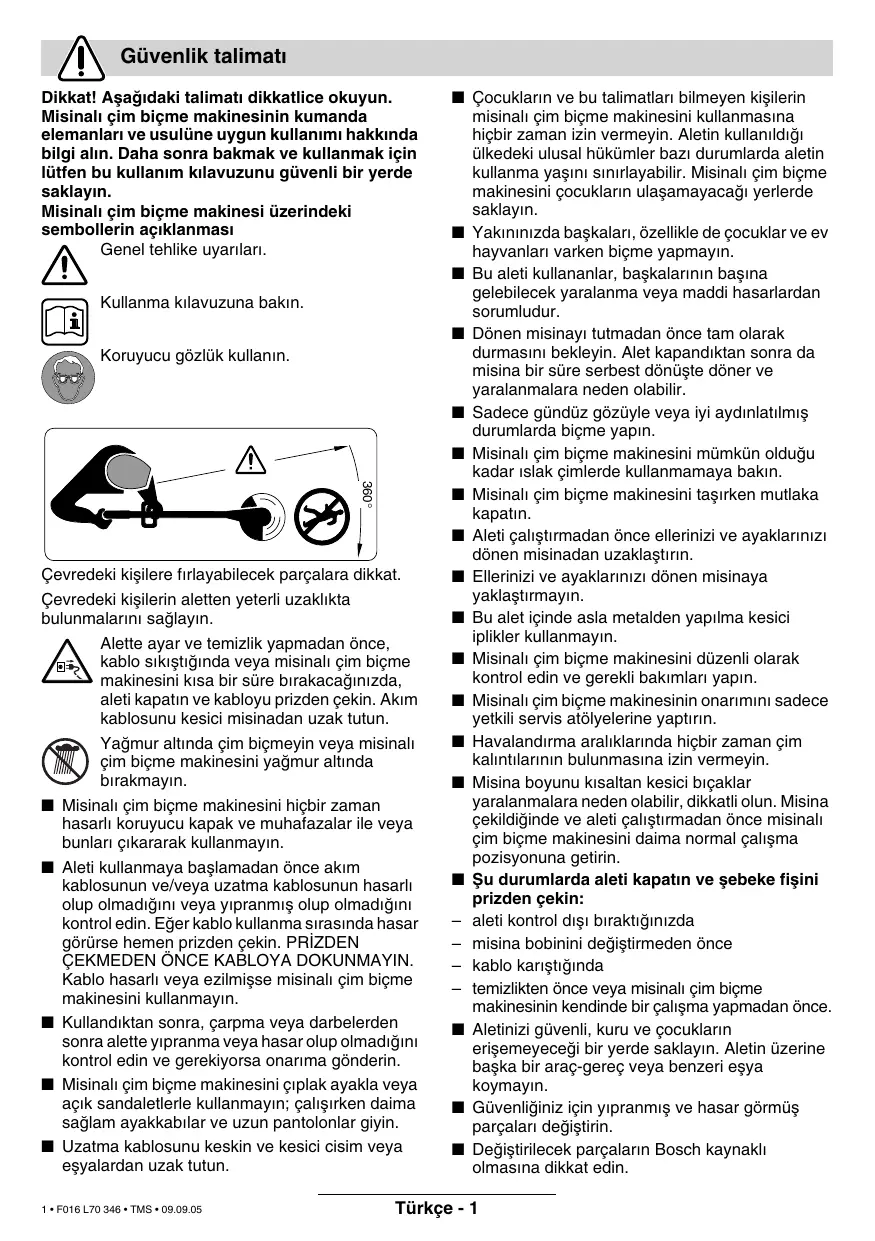 ■ Çocuklar∂n ve bu talimatlar∂ bilmeyen kiµilerin misinal∂ çim biçme makinesini kullanmas∂na hiçbir zaman izin vermeyin. Aletin kullan∂ld∂π∂ ülkedeki ulusal hükümler baz∂ durumlarda aletin kullanma yaµ∂n∂ s∂n∂rlayabilir. Misinal∂ çim biçme makinesini çocuklar∂n ulaµamayacaπ∂ yerlerde saklay∂n. ■ Yak∂n∂n∂zda baµkalar∂, özellikle de çocuklar ve ev hayvanlar∂ varken biçme yapmay∂n. ■ Bu aleti kullananlar, baµkalar∂n∂n baµ∂na gelebilecek yaralanma veya maddi hasarlardan sorumludur. ■ Dönen misinay∂ tutmadan önce tam olarak durmas∂n∂ bekleyin. Alet kapand∂ktan sonra da misina bir süre serbest dönüµte döner ve yaralanmalara neden olabilir. ■ Sadece gündüz gözüyle veya iyi ayd∂nlat∂lm∂µ durumlarda biçme yap∂n. ■ Misinal∂ çim biçme makinesini mümkün olduπu kadar ∂slak çimlerde kullanmamaya bak∂n. ■ Misinal∂ çim biçme makinesini taµ∂rken mutlaka kapat∂n. ■ Aleti çal∂µt∂rmadan önce ellerinizi ve ayaklar∂n∂z∂ dönen misinadan uzaklaµt∂r∂n. ■ Ellerinizi ve ayaklar∂n∂z∂ dönen misinaya yaklaµt∂rmay∂n. ■ Bu alet içinde asla metalden yap∂lma kesici iplikler kullanmay∂n. ■ Misinal∂ çim biçme makinesini düzenli olarak kontrol edin ve gerekli bak∂mlar∂ yap∂n. ■ Misinal∂ çim biçme makinesinin onar∂m∂n∂ sadece yetkili servis atölyelerine yapt∂r∂n. ■ Havaland∂rma aral∂klar∂nda hiçbir zaman çim kal∂nt∂lar∂n∂n bulunmas∂na izin vermeyin. ■ Misina boyunu k∂saltan kesici b∂çaklar yaralanmalara neden olabilir, dikkatli olun. Misina çekildiπinde ve aleti çal∂µt∂rmadan önce misinal∂ çim biçme makinesini daima normal çal∂µma pozisyonuna getirin. ■ Ωu durumlarda aleti kapat∂n ve µebeke fiµini prizden çekin: – aleti kontrol d∂µ∂ b∂rakt∂π∂n∂zda – misina bobinini deπiµtirmeden önce – kablo kar∂µt∂π∂nda – temizlikten önce veya misinal∂ çim biçme makinesinin kendinde bir çal∂µma yapmadan önce. ■ Aletinizi güvenli, kuru ve çocuklar∂n eriµemeyeceπi bir yerde saklay∂n. Aletin üzerine baµka bir araç-gereç veya benzeri eµya koymay∂n. ■ Güvenliπiniz için y∂pranm∂µ ve hasar görmüµ parçalar∂ deπiµtirin. ■ Deπiµtirilecek parçalar∂n Bosch kaynakl∂ olmas∂na dikkat edin. Türkçe - 1 Teknik veriler Misinal∂ çim biçme makinesi Sipariµ no. Giriµ gücü Boµtaki devir say∂s∂ Misina besleme (ayar∂) Ayarlanabilir tutamak Trimer baµ∂ aç∂ ayar∂/ Kenar kesme ayar∂ Kesici misina Kesme çap∂ Misina bobininin kapasitesi Ekstra güçlü kesici misina Aπ∂rl∂π∂ (özel aksesuar olmadan) Koruma s∂n∂f∂ Seri numaras∂ ART 23 COMBITRIM/ ART 2300 COMBITRIM 3 600 H78 B.. [W] 400 [/dak] 12 500 ART 26 COMBITRIM/ ART 2600 COMBITRIM 3 600 H78 C..