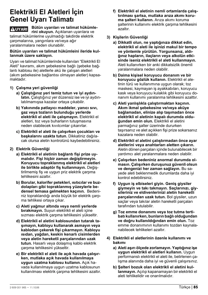 µπαταρίες/οι επαναφορτιζµενες µπαταρίες πρέπει να ανακυκλώνονται. Τηρούµε το δικαίωµα αλλαγών. 84 | Eλληνικά 2 609 001 965 • 11.10.06 Elektrikli El Aletleri İçin Genel Uyarı Talimatı Bütün uyarıları ve talimat hükümlerini okuyun. Açıklanan uyarılara ve talimat hükümlerine uyulmadığı takdirde elektrik çarpmalarına, yangınlara ve/veya ağır yaralanmalara neden olunabilir. UYARI Bütün uyarıları ve talimat hükümleini ileride kullanmak üzere saklayın. Uyarı ve talimat hükümlerinde kullanılan “Elektrikli El Aleti” kavramı, akım şebekesine bağlı (şebeke bağlantı kablosu ile) aletlerle akü ile çalışan aletleri (akım şebekesine bağlantısı olmayan aletler) kapsamaktadır.