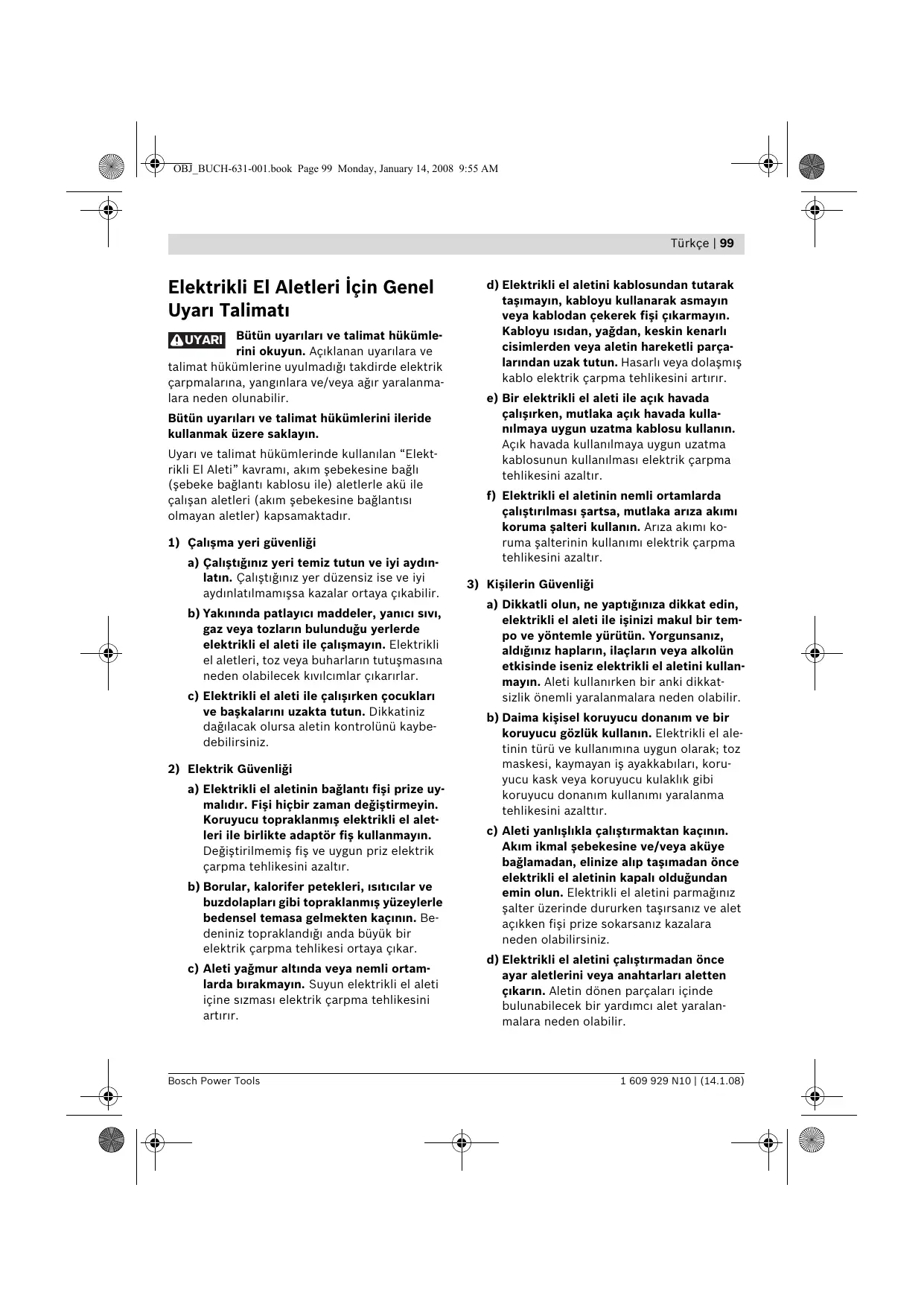 Bütün uyarlar ve talimat hükümlerini okuyun. Açklanan uyarlara ve talimat hükümlerine uyulmadğ takdirde elektrik çarpmalarna, yangnlara ve/veya ağr yaralanmalara neden olunabilir. UYARI Bütün uyarlar ve talimat hükümlerini ileride kullanmak üzere saklayn. Uyar ve talimat hükümlerinde kullanlan “Elektrikli El Aleti” kavram, akm şebekesine bağl (şebeke bağlant kablosu ile) aletlerle akü ile çalşan aletleri (akm şebekesine bağlants olmayan aletler) kapsamaktadr.