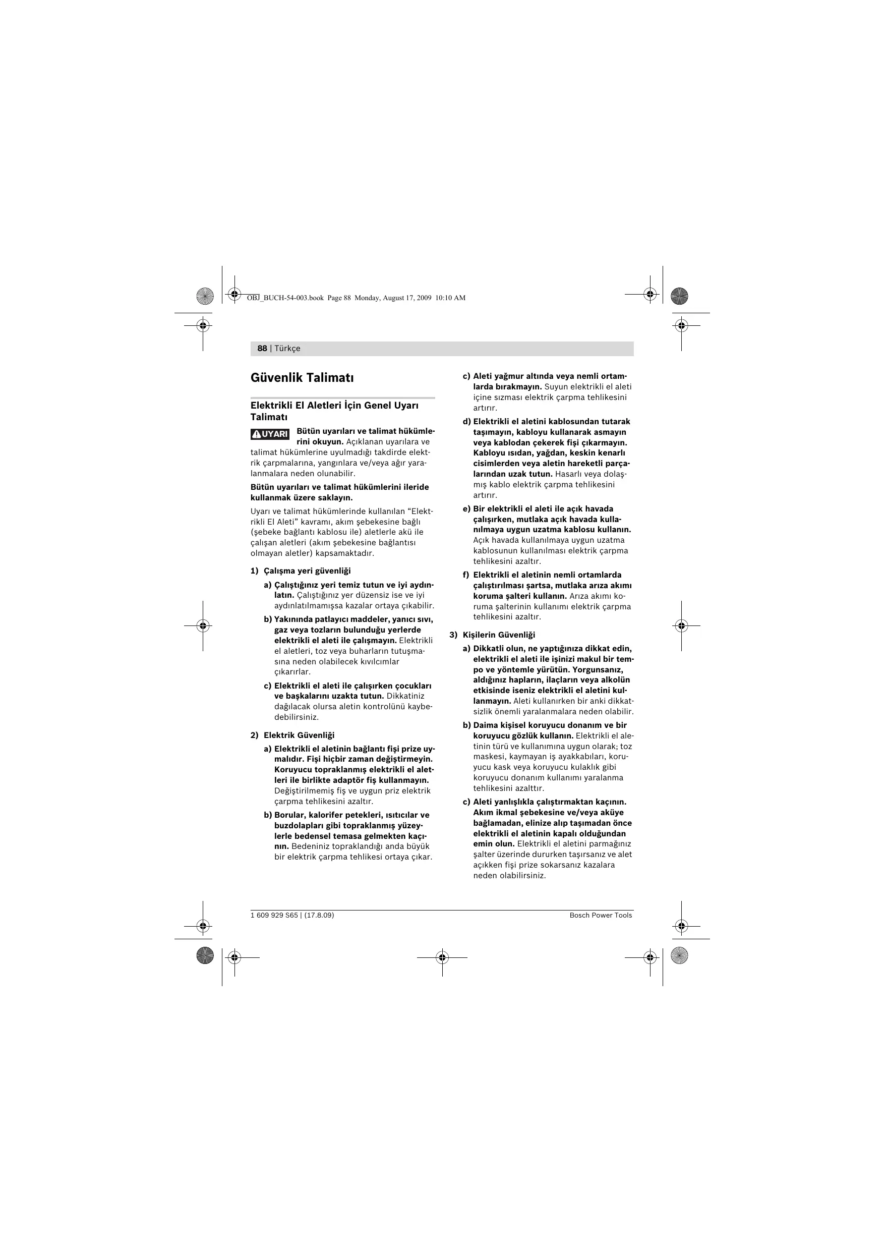a) Dikkatli olun, ne yaptğnza dikkat edin, elektrikli el aleti ile işinizi makul bir tempo ve yöntemle yürütün. Yorgunsanz, aldğnz haplarn, ilaçlarn veya alkolün etkisinde iseniz elektrikli el aletini kullanmayn. Aleti kullanrken bir anki dikkatsizlik önemli yaralanmalara neden olabilir. b) Daima kişisel koruyucu donanm ve bir koruyucu gözlük kullann. Elektrikli el aletinin türü ve kullanmna uygun olarak; toz maskesi, kaymayan iş ayakkablar, koruyucu kask veya koruyucu kulaklk gibi koruyucu donanm kullanm yaralanma tehlikesini azalttr. c) Aleti yanlşlkla çalştrmaktan kaçnn. Akm ikmal şebekesine ve/veya aküye bağlamadan, elinize alp taşmadan önce elektrikli el aletinin kapal olduğundan emin olun. Elektrikli el aletini parmağnz şalter üzerinde dururken taşrsanz ve alet açkken fişi prize sokarsanz kazalara neden olabilirsiniz. Bosch Power Tools OBJ_BUCH-54-003.book Page 89 Monday, August 17, 2009 10:10 AM Türkçe | 89 d) Elektrikli el aletini çalştrmadan önce ayar aletlerini veya anahtarlar aletten çkarn. Aletin dönen parçalar içinde bulunabilecek bir yardmc alet yaralanmalara neden olabilir. e) Çalşrken bedeniniz anormal durumda olmasn. Çalşrken duruşunuz güvenli olsun ve dengenizi her zaman koruyun. Bu sayede aleti beklenmedik durumlarda daha iyi kontrol edebilirsiniz. f) Uygun iş elbiseleri giyin. Geniş giysiler giymeyin ve tak takmayn. Saçlarnz, giysileriniz ve eldivenlerinizi aletin hareketli parçalarndan uzak tutun. Bol giysiler, uzun saçlar veya taklar aletin hareketli parçalar tarafndan tutulabilir. g) Toz emme donanm veya toz tutma tertibat kullanrken, bunlarn bağl olduğundan ve doğru kullanldğndan emin olun. Toz emme donanmnn kullanm tozdan kaynalanabilecek tehlikeleri azaltr.