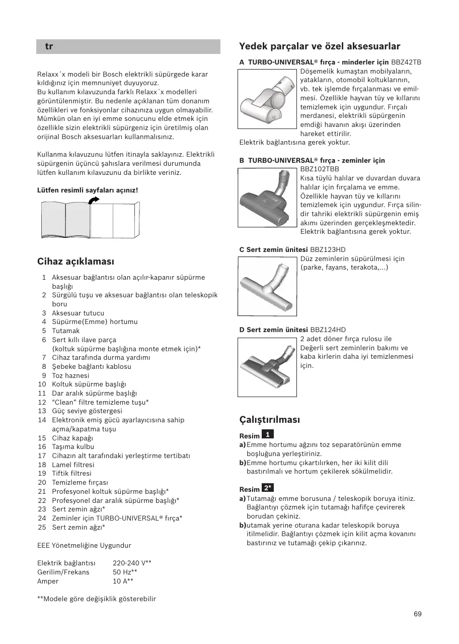 Relaxx´x modeli bir Bosch elektrikli süpürgede karar kıldığınız için memnuniyet duyuyoruz. Bu kullanım kılavuzunda farklı Relaxx´x modelleri görüntülenmiştir. Bu nedenle açıklanan tüm donanım özellikleri ve fonksiyonlar cihazınıza uygun olmayabilir. Mümkün olan en iyi emme sonucunu elde etmek için özellikle sizin elektrikli süpürgeniz için üretilmiş olan orijinal Bosch aksesuarları kullanmalısınız. Kullanma kılavuzunu lütfen itinayla saklayınız. Elektrikli süpürgenin üçüncü şahıslara verilmesi durumunda lütfen kullanım kılavuzunu da birlikte veriniz. Lütfen resimli sayfaları açınız!
