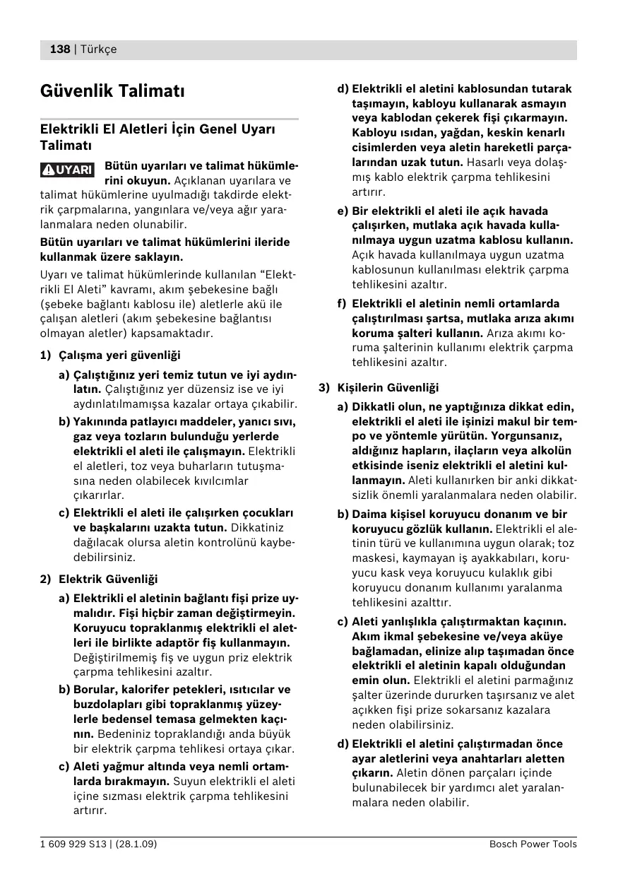 a) Elektrikli el aletinin bağlant fişi prize uymaldr. Fişi hiçbir zaman değiştirmeyin. Koruyucu topraklanmş elektrikli el aletleri ile birlikte adaptör fiş kullanmayn. Değiştirilmemiş fiş ve uygun priz elektrik çarpma tehlikesini azaltr. b) Borular, kalorifer petekleri, stclar ve buzdolaplar gibi topraklanmş yüzeylerle bedensel temasa gelmekten kaçnn. Bedeniniz topraklandğ anda büyük bir elektrik çarpma tehlikesi ortaya çkar. c) Aleti yağmur altnda veya nemli ortamlarda brakmayn. Suyun elektrikli el aleti içine szmas elektrik çarpma tehlikesini artrr. 1 609 929 S13 | (28.1.09) d) Elektrikli el aletini kablosundan tutarak taşmayn, kabloyu kullanarak asmayn veya kablodan çekerek fişi çkarmayn. Kabloyu sdan, yağdan, keskin kenarl cisimlerden veya aletin hareketli parçalarndan uzak tutun. Hasarl veya dolaşmş kablo elektrik çarpma tehlikesini artrr. e) Bir elektrikli el aleti ile açk havada çalşrken, mutlaka açk havada kullanlmaya uygun uzatma kablosu kullann. Açk havada kullanlmaya uygun uzatma kablosunun kullanlmas elektrik çarpma tehlikesini azaltr. f) Elektrikli el aletinin nemli ortamlarda çalştrlmas şartsa, mutlaka arza akm koruma şalteri kullann. Arza akm koruma şalterinin kullanm elektrik çarpma tehlikesini azaltr.
