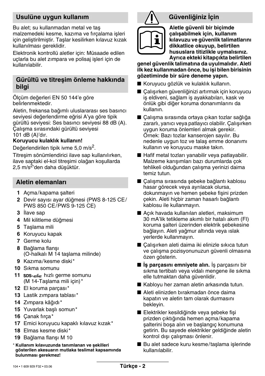 Usulüne uygun kullan∂m Güvenliπiniz ∑çin Bu alet; su kullanmadan metal ve taµ malzemedeki kesme, kaz∂ma ve f∂rçalama iµleri için geliµtirilmiµtir. Taµlar kesilirken k∂lavuz k∂zak kullan∂lmas∂ gereklidir. Elektronik kontrollü aletler için: Müsaade edilen uçlarla bu alet z∂mpara ve polisaj iµleri için de kullan∂labilir. Gürültü ve titreµim önleme hakk∂nda bilgi Ölçüm deπerleri EN 50 144’e göre belirlenmektedir. Aletin, frekansa baπ∂ml∂ uluslararas∂ ses bas∂nc∂ seviyesi deπerlendirme eπrisi A’ya göre tipik gürültü seviyesi: Ses bas∂nc∂ seviyesi 88 dB (A). Çal∂µma s∂ras∂ndaki gürültü seviyesi 101 dB (A)’d∂r. Koruyucu kulakl∂k kullan∂n! Deπerlendirilen tipik ivme 5,0 m/s2. Titreµim sönümlendirici ilave sap kullan∂l∂rken, ilave saptaki el-kol titreµimi olaπan koµullarda 2,5 m/s2’den daha düµüktür. Aletin elemanlar∂ 1 Açma/kapama µalteri 2 Devir say∂s∂ ayar düπmesi (PWS 8-125 CE / PWS 850 CE/PWS 9-125 CE) 3 ∑lave sap 4 Mil kilitleme düπmesi 5 Taµlama mili 6 Koruyucu kapak 7 Germe kolu 8 Baπlama flanµ∂ (O-halkal∂ M 14 taµlama milinde) 9 Kaz∂ma/kesme diski* 10 S∂kma somunu h∂zl∂ germe somunu (M 14-Taµlama mili için)* 12 El koruma parças∂* 13 Lastik z∂mpara tablas∂* 14 Z∂mpara kâπ∂d∂* 15 Yuvarlak baµl∂ somun* 16 Çanak f∂rça* 17 Emici koruyucu kapakl∂ k∂lavuz k∂zak * 18 Elmas kesme diski* 19 Baπlama flanµ∂ M 10