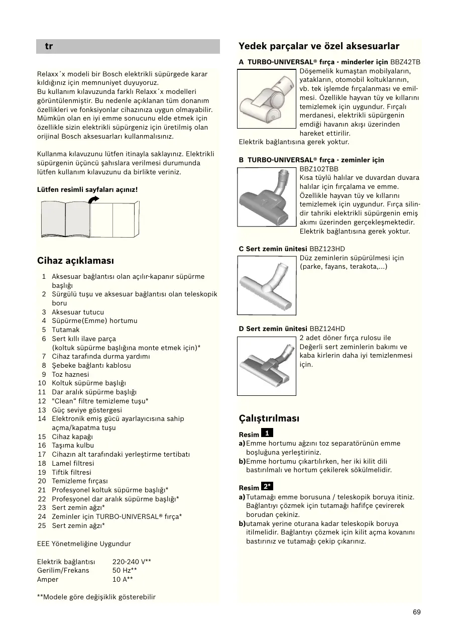 Yedek parçalar ve özel aksesuarlar Relaxx´x modeli bir Bosch elektrikli süpürgede karar kıldığınız için memnuniyet duyuyoruz. Bu kullanım kılavuzunda farklı Relaxx´x modelleri görüntülenmiştir. Bu nedenle açıklanan tüm donanım özellikleri ve fonksiyonlar cihazınıza uygun olmayabilir. Mümkün olan en iyi emme sonucunu elde etmek için özellikle sizin elektrikli süpürgeniz için üretilmiş olan orijinal Bosch aksesuarları kullanmalısınız. Kullanma kılavuzunu lütfen itinayla saklayınız. Elektrikli süpürgenin üçüncü şahıslara verilmesi durumunda lütfen kullanım kılavuzunu da birlikte veriniz. Lütfen resimli sayfaları açınız! Cihaz açıklaması 1 Aksesuar bağlantısı olan açılır-kapanır süpürme başlığı 2 Sürgülü tuşu ve aksesuar bağlantısı olan teleskopik boru 3 Aksesuar tutucu 4 Süpürme(Emme) hortumu 5 Tutamak 6 Sert kıllı ilave parça (koltuk süpürme başlığına monte etmek için)* 7 Cihaz tarafında durma yardımı 8 Şebeke bağlantı kablosu 9 Toz haznesi 10 Koltuk süpürme başlığı 11 Dar aralık süpürme başlığı 12 "Clean“ filtre temizleme tuşu* 13 Güç seviye göstergesi 14 Elektronik emiş gücü ayarlayıcısına sahip açma/kapatma tuşu 15 Cihaz kapağı 16 Taşıma kulbu 17 Cihazın alt tarafındaki yerleştirme tertibatı 18 Lamel filtresi 19 Tiftik filtresi 20 Temizleme fırçası 21 Profesyonel koltuk süpürme başlığı* 22 Profesyonel dar aralık süpürme başlığı* 23 Sert zemin ağzı* 24 Zeminler için TURBO-UNIVERSAL® fırça* 25 Sert zemin ağzı* EEE Yönetmeliğine Uygundur Elektrik bağlantısı Gerilim/Frekans Amper A TURBO-UNIVERSAL® fırça - minderler için BBZ42TB Döşemelik kumaştan mobilyaların, yatakların, otomobil koltuklarının, vb. tek işlemde fırçalanması ve emilmesi. Özellikle hayvan tüy ve kıllarını temizlemek için uygundur. Fırçalı merdanesi, elektrikli süpürgenin emdiği havanın akışı üzerinden hareket ettirilir. Elektrik bağlantısına gerek yoktur. B TURBO-UNIVERSAL® fırça - zeminler için BBZ102TBB Kısa tüylü halılar ve duvardan duvara halılar için fırçalama ve emme. Özellikle hayvan tüy ve kıllarını temizlemek için uygundur. Fırça silindir tahriki elektrikli süpürgenin emiş akımı üzerinden gerçekleşmektedir. Elektrik bağlantısına gerek yoktur. C Sert zemin ünitesi BBZ123HD Düz zeminlerin süpürülmesi için (parke, fayans, terakota,...) D Sert zemin ünitesi BBZ124HD 2 adet döner fırça rulosu ile Değerli sert zeminlerin bakımı ve kaba kirlerin daha iyi temizlenmesi için. Çalıştırılması Resim 1 a)Emme hortumu ağzını toz separatörünün emme boşluğuna yerleştiriniz. b)Emme hortumu çıkartılırken, her iki kilit dili bastırılmalı ve hortum çekilerek sökülmelidir. Resim 2* a)Tutamağı emme borusuna / teleskopik boruya itiniz. Bağlantıyı çözmek için tutamağı hafifçe çevirerek borudan çekiniz. b)utamak yerine oturana kadar teleskopik boruya itilmelidir. Bağlantıyı çözmek için kilit açma kovanını bastırınız ve tutamağı çekip çıkarınız. 220-240 V** 50 Hz** 10 A** **Modele göre değişiklik gösterebilir