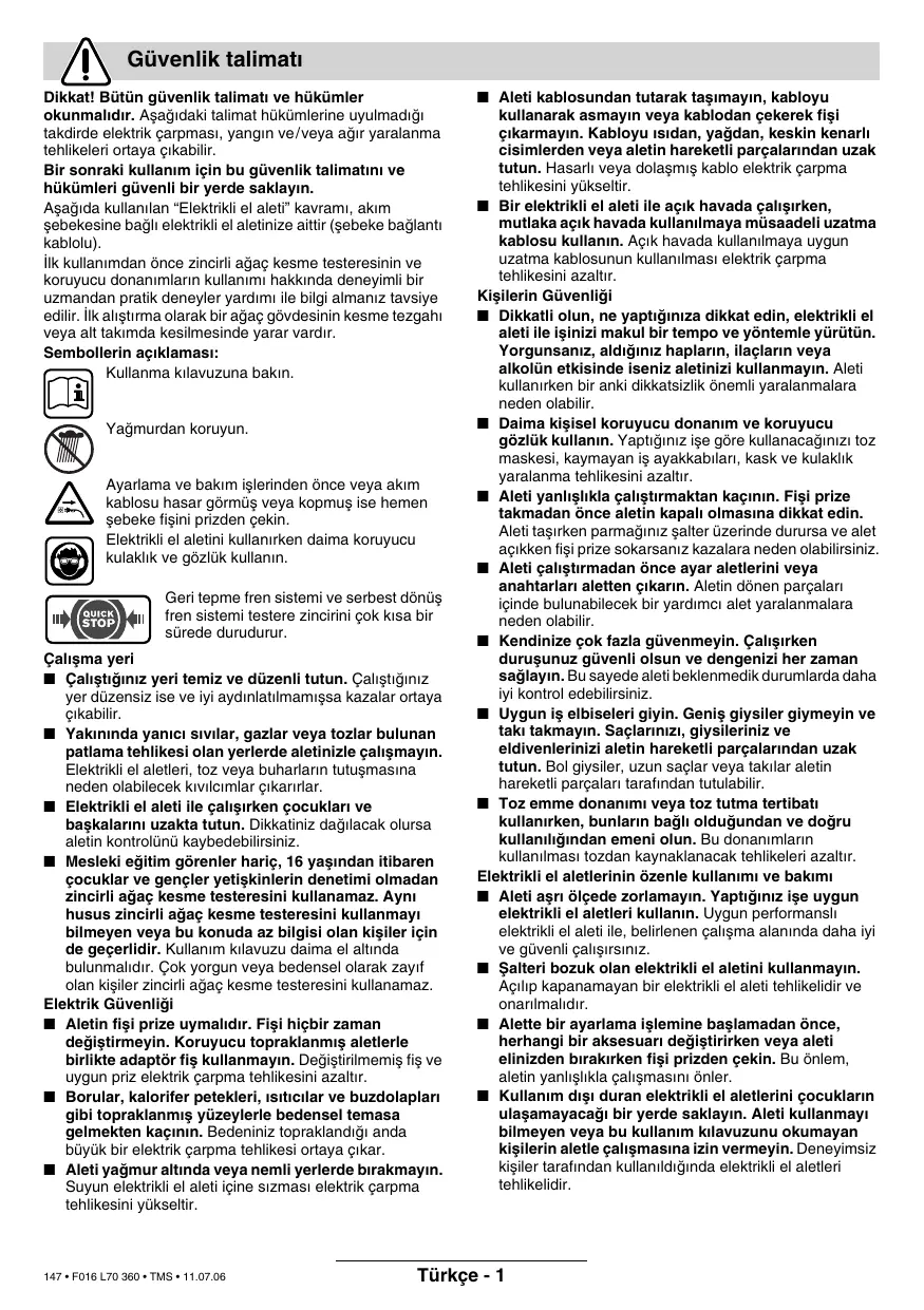 à chaîne Avant de commencer le sciage Effectuer les contrôles suivants avant de mettre la tronçonneuse à chaîne en service et, à intervalles réguliers, durant le sciage : – La tronçonneuse à chaîne est-elle dans un état de fonctionnement sûr ? – B Le réservoir d’huile est-il rempli ? Contrôler le voyant du niveau d’huile 26 avant de commencer le travail, et, à intervalles réguliers, durant le sciage. Rajouter de l’huile dès que le niveau d’huile a atteint le bord inférieur du voyant de contrôle. La quantité contenue dans le réservoir suffit pour 15 minutes env. et dépend des pauses et de l’intensité du travail. – La chaîne est-elle correctement tendue et affûtée ? Durant le sciage, contrôler la tension de la chaîne toutes les 10 minutes. Il faut prendre en considération que les chaînes neuves en particulier s’élargissent de manière importante. L’état de la chaîne influence dans une large mesure la performance de la tronçonneuse à chaîne. Seules les chaînes en parfait état protègent l’appareil contre une surcharge. – Le frein de chaîne est-il débloqué et son fonctionnement est-il assuré ? – Portez-vous les équipements de protection nécessaires ? Porter des lunettes de protection ainsi qu’une protection acoustique. Nous conseillons également le port d’un équipement de protection pour la tête, les mains, les jambes et 35 • F016 L70 360 • TMS • 11.07.06