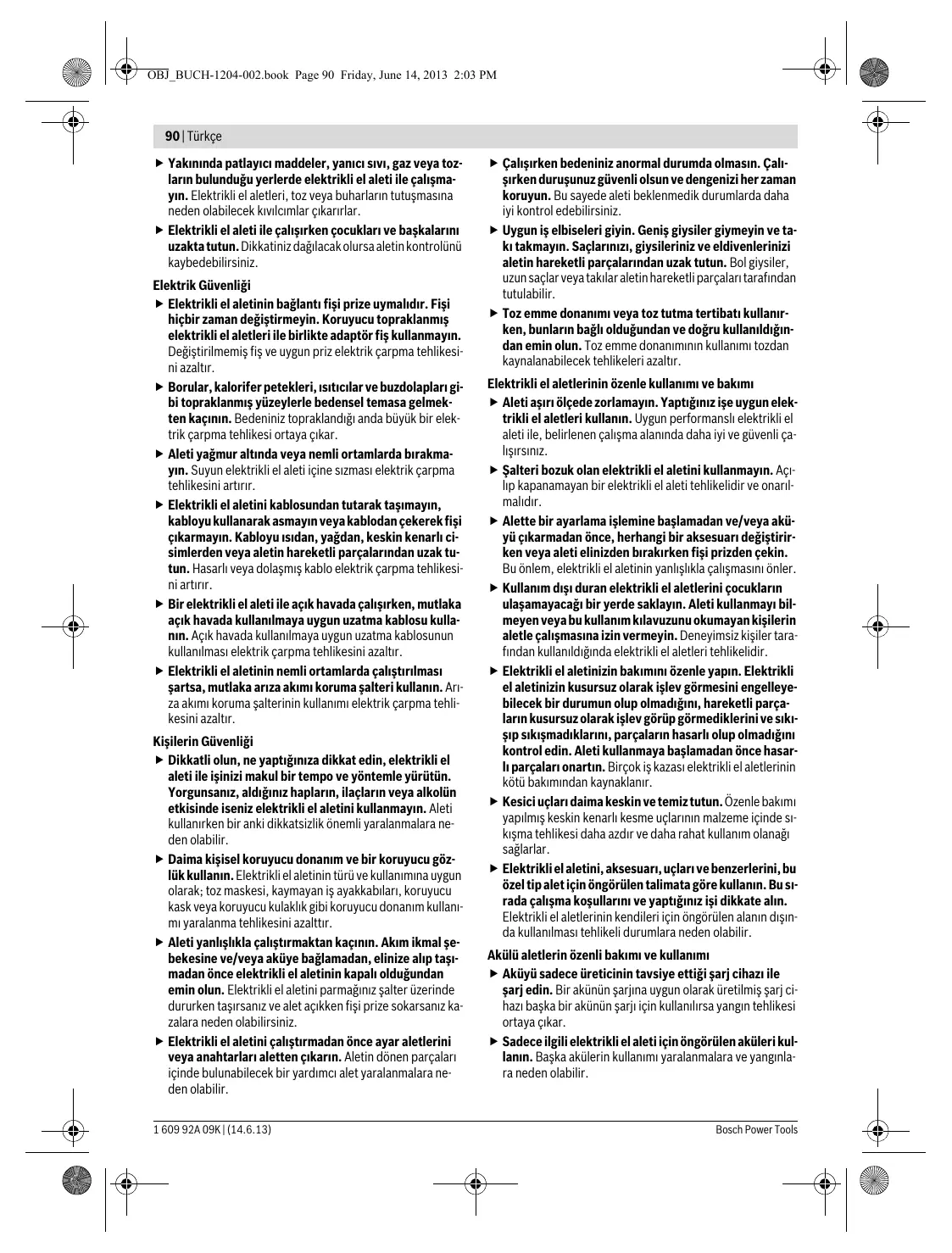 Türkçe Güvenlik Talimatı Elektrikli El Aletleri İçin Genel Uyarı Talimatı UYARI Bütün uyarıları ve talimat hükümlerini okuyun. Açıklanan uyarılara ve talimat hükümlerine uyulmadığı takdirde elektrik çarpmalarına, yangınlara ve/veya ağır yaralanmalara neden olunabilir. Bütün uyarıları ve talimat hükümlerini ileride kullanmak üzere saklayın. Uyarı ve talimat hükümlerinde kullanılan “Elektrikli El Aleti” kavramı, akım şebekesine bağlı (şebeke bağlantı kablosu ile) aletlerle akü ile çalışan aletleri (akım şebekesine bağlantısı olmayan aletler) kapsamaktadır. Çalışma yeri güvenliği Çalıştığınız yeri temiz tutun ve iyi aydınlatın. Çalıştığınız yer düzensiz ise ve iyi aydınlatılmamışsa kazalar ortaya çıkabilir. 1 609 92A 09K | (14.6.13)