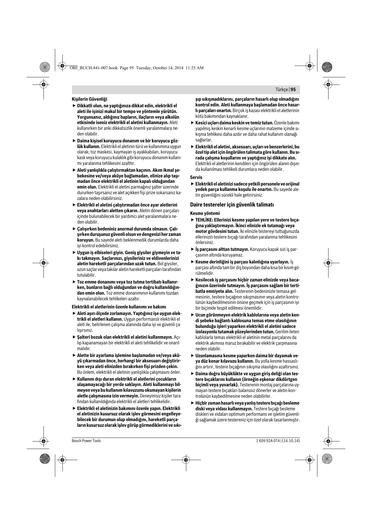 Τα ηλεκτρικά εργαλεία, τα εξαρτήματα και οι συσκευασίες πρέπει να ανακυκλώνονται με τρόπο φιλικό προς το περιβάλλον. Μην ρίχνετε τα ηλεκτρικά εργαλεία στα απορρίμματα του σπιτιού σας! Μόνο για χώρες της ΕΕ: Σύμφωνα με την Κοινοτική Οδηγία 2012/19/EE σχετικά με τις παλαιές ηλεκτρικές και ηλεκτρονικές συσκευές και τη μεταφορά της οδηγίας αυτής σε εθνικό δίκαιο δεν είναι πλέον υποχρεωτικό τα άχρηστα ηλεκτρικά εργαλεία να συλλέγονται ξεχωριστά για να ανακυκλωθούν με τρόπο φιλικό προς το περιβάλλον. Τηρούμε το δικαίωμα αλλαγών. 1 609 92A 0T4 | (14.10.14) Türkçe Güvenlik Talimatı Elektrikli El Aletleri İçin Genel Uyarı Talimatı UYARI Bütün uyarıları ve talimat hükümlerini okuyun. Açıklanan uyarılara ve talimat hükümlerine uyulmadığı takdirde elektrik çarpmalarına, yangınlara ve/veya ağır yaralanmalara neden olunabilir. Bütün uyarıları ve talimat hükümlerini ileride kullanmak üzere saklayın. Uyarı ve talimat hükümlerinde kullanılan “Elektrikli El Aleti” kavramı, akım şebekesine bağlı (şebeke bağlantı kablosu ile) aletlerle akü ile çalışan aletleri (akım şebekesine bağlantısı olmayan aletler) kapsamaktadır. Çalışma yeri güvenliği Çalıştığınız yeri temiz tutun ve iyi aydınlatın. Çalıştığınız yer düzensiz ise ve iyi aydınlatılmamışsa kazalar ortaya çıkabilir. Yakınında patlayıcı maddeler, yanıcı sıvı, gaz veya tozların bulunduğu yerlerde elektrikli el aleti ile çalışmayın. Elektrikli el aletleri, toz veya buharların tutuşmasına neden olabilecek kıvılcımlar çıkarırlar. Elektrikli el aleti ile çalışırken çocukları ve başkalarını uzakta tutun. Dikkatiniz dağılacak olursa aletin kontrolünü kaybedebilirsiniz. Elektrik Güvenliği Elektrikli el aletinin bağlantı fişi prize uymalıdır. Fişi hiçbir zaman değiştirmeyin. Koruyucu topraklanmış elektrikli el aletleri ile birlikte adaptör fiş kullanmayın. Değiştirilmemiş fiş ve uygun priz elektrik çarpma tehlikesini azaltır. Borular, kalorifer petekleri, ısıtıcılar ve buzdolapları gibi topraklanmış yüzeylerle bedensel temasa gelmekten kaçının. Bedeniniz topraklandığı anda büyük bir elektrik çarpma tehlikesi ortaya çıkar. Aleti yağmur altında veya nemli ortamlarda bırakmayın. Suyun elektrikli el aleti içine sızması elektrik çarpma tehlikesini artırır. Elektrikli el aletini kablosundan tutarak taşımayın, kabloyu kullanarak asmayın veya kablodan çekerek fişi çıkarmayın. Kabloyu ısıdan, yağdan, keskin kenarlı cisimlerden veya aletin hareketli parçalarından uzak tutun. Hasarlı veya dolaşmış kablo elektrik çarpma tehlikesini artırır. Bir elektrikli el aleti ile açık havada çalışırken, mutlaka açık havada kullanılmaya uygun uzatma kablosu kullanın. Açık havada kullanılmaya uygun uzatma kablosunun kullanılması elektrik çarpma tehlikesini azaltır. Elektrikli el aletinin nemli ortamlarda çalıştırılması şartsa, mutlaka arıza akımı koruma şalteri kullanın. Arıza akımı koruma şalterinin kullanımı elektrik çarpma tehlikesini azaltır. Bosch Power Tools OBJ_BUCH-841-007.book Page 95 Tuesday, October 14, 2014 11:25 AM Türkçe | 95 Kişilerin Güvenliği Dikkatli olun, ne yaptığınıza dikkat edin, elektrikli el aleti ile işinizi makul bir tempo ve yöntemle yürütün. Yorgunsanız, aldığınız hapların, ilaçların veya alkolün etkisinde iseniz elektrikli el aletini kullanmayın. Aleti kullanırken bir anki dikkatsizlik önemli yaralanmalara neden olabilir. Daima kişisel koruyucu donanım ve bir koruyucu gözlük kullanın. Elektrikli el aletinin türü ve kullanımına uygun olarak; toz maskesi, kaymayan iş ayakkabıları, koruyucu kask veya koruyucu kulaklık gibi koruyucu donanım kullanımı yaralanma tehlikesini azalttır. Aleti yanlışlıkla çalıştırmaktan kaçının. Akım ikmal şebekesine ve/veya aküye bağlamadan, elinize alıp taşımadan önce elektrikli el aletinin kapalı olduğundan emin olun. Elektrikli el aletini parmağınız şalter üzerinde dururken taşırsanız ve alet açıkken fişi prize sokarsanız kazalara neden olabilirsiniz. Elektrikli el aletini çalıştırmadan önce ayar aletlerini veya anahtarları aletten çıkarın. Aletin dönen parçaları içinde bulunabilecek bir yardımcı alet yaralanmalara neden olabilir. Çalışırken bedeniniz anormal durumda olmasın. Çalışırken duruşunuz güvenli olsun ve dengenizi her zaman koruyun. Bu sayede aleti beklenmedik durumlarda daha iyi kontrol edebilirsiniz. Uygun iş elbiseleri giyin. Geniş giysiler giymeyin ve takı takmayın. Saçlarınızı, giysileriniz ve eldivenlerinizi aletin hareketli parçalarından uzak tutun. Bol giysiler, uzun saçlar veya takılar aletin hareketli parçaları tarafından tutulabilir. Toz emme donanımı veya toz tutma tertibatı kullanırken, bunların bağlı olduğundan ve doğru kullanıldığından emin olun. Toz emme donanımının kullanımı tozdan kaynalanabilecek tehlikeleri azaltır. Elektrikli el aletlerinin özenle kullanımı ve bakımı Aleti aşırı ölçede zorlamayın. Yaptığınız işe uygun elektrikli el aletleri kullanın. Uygun performanslı elektrikli el aleti ile, belirlenen çalışma alanında daha iyi ve güvenli çalışırsınız. Şalteri bozuk olan elektrikli el aletini kullanmayın. Açılıp kapanamayan bir elektrikli el aleti tehlikelidir ve onarılmalıdır. Alette bir ayarlama işlemine başlamadan ve/veya aküyü çıkarmadan önce, herhangi bir aksesuarı