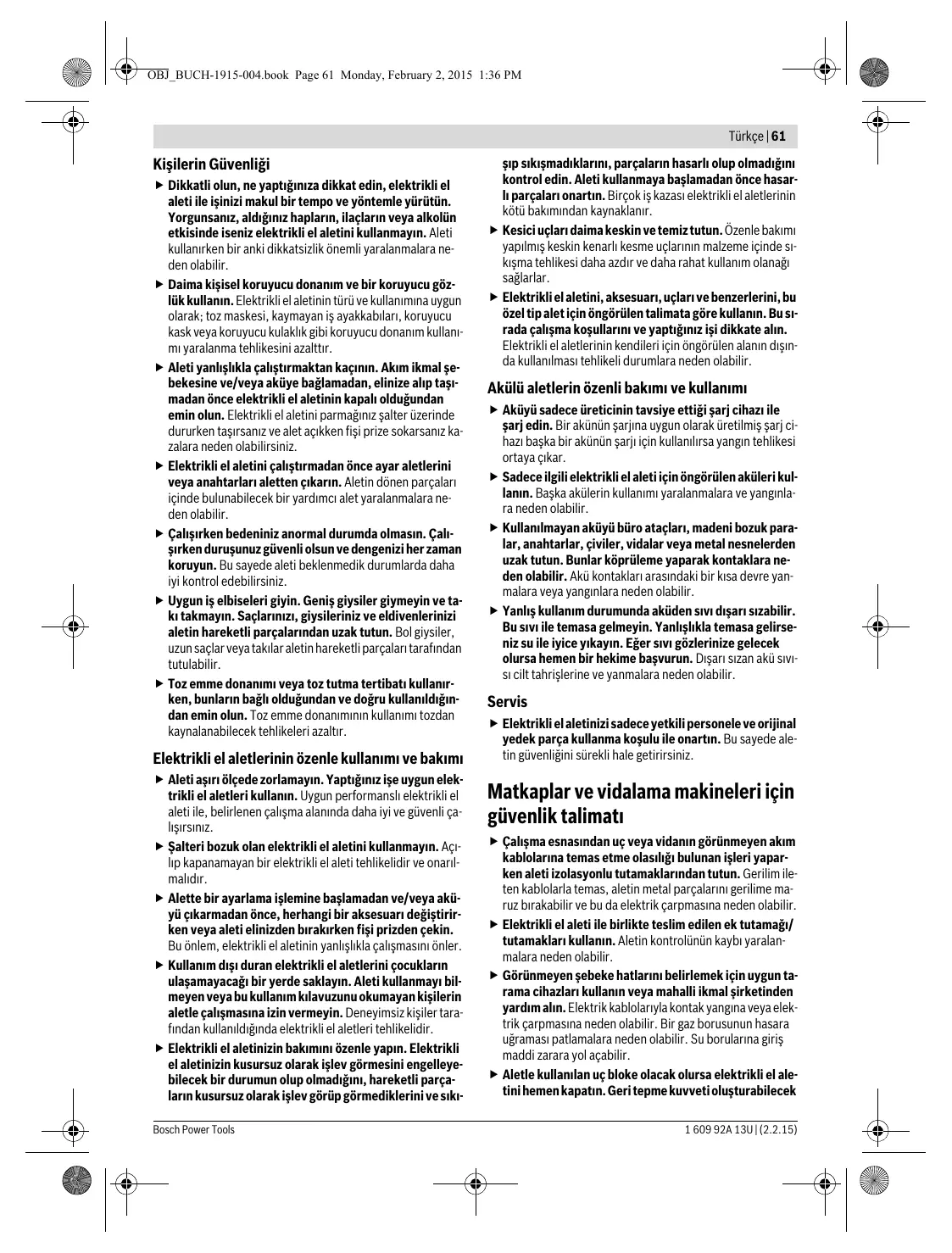 Τα ηλεκτρικά εργαλεία, οι μπαταρίες, τα εξαρτήματα και οι συσκευασίες πρέπει να ανακυκλώνονται με τρόπο φιλικό προς το περιβάλλον. Μην ρίχνετε τα ηλεκτρικά εργαλεία και τις μπαταρίες στα απορρίμματα του σπιτιού σας! Μόνο για χώρες της ΕΕ: Σύμφωνα με την Κοινοτική Οδηγία 2012/19/EE τα άχρηστα ηλεκτρικά εργαλεία και σύμφωνα με την Κοινοτική Οδηγία 2006/66/EΚ οι χαλασμένες ή αναλωμένες μπαταρίες δεν είναι πλέον υποχρεωτικό να συλλέγονται ξεχωριστά για να ανακυκλωθούν με τρόπο φιλικό προς το περιβάλλον. Τηρούμε το δικαίωμα αλλαγών. 1 609 92A 13U | (2.2.15) Türkçe Elektrikli El Aletleri İçin Genel Uyarı Talimatı UYARI Bütün uyarıları ve talimat hükümlerini okuyun. Açıklanan uyarılara ve talimat hükümlerine uyulmadığı takdirde elektrik çarpmalarına, yangınlara ve/veya ağır yaralanmalara neden olunabilir. Bütün uyarıları ve talimat hükümlerini ileride kullanmak üzere saklayın. Uyarı ve talimat hükümlerinde kullanılan “Elektrikli El Aleti” kavramı, akım şebekesine bağlı (şebeke bağlantı kablosu ile) aletlerle akü ile çalışan aletleri (akım şebekesine bağlantısı olmayan aletler) kapsamaktadır. Çalışma yeri güvenliği Çalıştığınız yeri temiz tutun ve iyi aydınlatın. Çalıştığınız yer düzensiz ise ve iyi aydınlatılmamışsa kazalar ortaya çıkabilir. Yakınında patlayıcı maddeler, yanıcı sıvı, gaz veya tozların bulunduğu yerlerde elektrikli el aleti ile çalışmayın. Elektrikli el aletleri, toz veya buharların tutuşmasına neden olabilecek kıvılcımlar çıkarırlar. Elektrikli el aleti ile çalışırken çocukları ve başkalarını uzakta tutun. Dikkatiniz dağılacak olursa aletin kontrolünü kaybedebilirsiniz. Elektrik Güvenliği Elektrikli el aletinin bağlantı fişi prize uymalıdır. Fişi hiçbir zaman değiştirmeyin. Koruyucu topraklanmış elektrikli el aletleri ile birlikte adaptör fiş kullanmayın. Değiştirilmemiş fiş ve uygun priz elektrik çarpma tehlikesini azaltır. Borular, kalorifer petekleri, ısıtıcılar ve buzdolapları gibi topraklanmış yüzeylerle bedensel temasa gelmekten kaçının. Bedeniniz topraklandığı anda büyük bir elektrik çarpma tehlikesi ortaya çıkar. Aleti yağmur altında veya nemli ortamlarda bırakmayın. Suyun elektrikli el aleti içine sızması elektrik çarpma tehlikesini artırır. Elektrikli el aletini kablosundan tutarak taşımayın, kabloyu kullanarak asmayın veya kablodan çekerek fişi çıkarmayın. Kabloyu ısıdan, yağdan, keskin kenarlı cisimlerden veya aletin hareketli parçalarından uzak tutun. Hasarlı veya dolaşmış kablo elektrik çarpma tehlikesini artırır. Bir elektrikli el aleti ile açık havada çalışırken, mutlaka açık havada kullanılmaya uygun uzatma kablosu kullanın. Açık havada kullanılmaya uygun uzatma kablosunun kullanılması elektrik çarpma tehlikesini azaltır. Elektrikli el aletinin nemli ortamlarda çalıştırılması şartsa, mutlaka arıza akımı koruma şalteri kullanın. Arıza akımı koruma şalterinin kullanımı elektrik çarpma tehlikesini azaltır. Bosch Power Tools OBJ_BUCH-1915-004.book Page 61 Monday, February 2, 2015 1:36 PM Türkçe | 61 Kişilerin Güvenliği Dikkatli olun, ne yaptığınıza dikkat edin, elektrikli el aleti ile işinizi makul bir tempo ve yöntemle yürütün. Yorgunsanız, aldığınız hapların, ilaçların veya alkolün etkisinde iseniz elektrikli el aletini kullanmayın. Aleti kullanırken bir anki dikkatsizlik önemli yaralanmalara neden olabilir. Daima kişisel koruyucu donanım ve bir koruyucu gözlük kullanın. Elektrikli el aletinin türü ve kullanımına uygun olarak; toz maskesi, kaymayan iş ayakkabıları, koruyucu kask veya koruyucu kulaklık gibi koruyucu donanım kullanımı yaralanma tehlikesini azalttır. Aleti yanlışlıkla çalıştırmaktan kaçının. Akım ikmal şebekesine ve/veya aküye bağlamadan, elinize alıp taşımadan önce elektrikli el aletinin kapalı olduğundan emin olun. Elektrikli el aletini parmağınız şalter üzerinde dururken taşırsanız ve alet açıkken fişi prize sokarsanız kazalara neden olabilirsiniz. Elektrikli el aletini çalıştırmadan önce ayar aletlerini veya anahtarları aletten çıkarın. Aletin dönen parçaları içinde bulunabilecek bir yardımcı alet yaralanmalara neden olabilir. Çalışırken bedeniniz anormal durumda olmasın. Çalışırken duruşunuz güvenli olsun ve dengenizi her zaman koruyun. Bu sayede aleti beklenmedik durumlarda daha iyi kontrol edebilirsiniz. Uygun iş elbiseleri giyin. Geniş giysiler giymeyin ve takı takmayın. Saçlarınızı, giysileriniz ve eldivenlerinizi aletin hareketli parçalarından uzak tutun. Bol giysiler, uzun saçlar veya takılar aletin hareketli parçaları tarafından tutulabilir. Toz emme donanımı veya toz tutma tertibatı kullanırken, bunların bağlı olduğundan ve doğru kullanıldığından emin olun. Toz emme donanımının kullanımı tozdan kaynalanabilecek tehlikeleri azaltır. Elektrikli el aletlerinin özenle kullanımı ve bakımı Aleti aşırı ölçede zorlamayın. Yaptığınız işe uygun elektrikli el aletleri kullanın. Uygun performanslı elektrikli el aleti ile, belirlenen çalışma alanında daha iyi ve güvenli çalışırsınız. Şalteri bozuk olan elektrikli el aletini kullanmayın. Açılıp kapanamayan bir elektrikli el aleti tehlikelidir ve onarılmalıdır. Alette bir ayarlama işlemine başlamadan ve/veya aküyü çıkarmadan önce, herhangi bir aksesuarı değiştirirken veya a