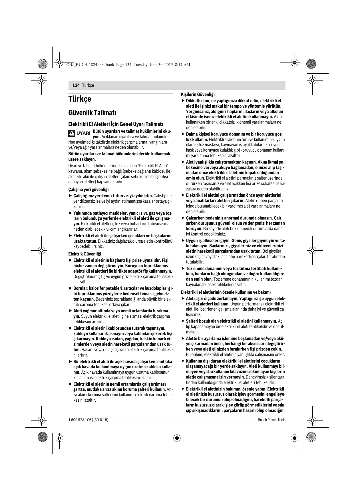 Τα ηλεκτρικά εργαλεία, τα εξαρτήματα και οι συσκευασίες πρέπει να ανακυκλώνονται με τρόπο φιλικό προς το περιβάλλον. Μην ρίχνετε τα ηλεκτρικά εργαλεία στα απορρίμματα του σπιτιού σας! Μόνο για χώρες της ΕΕ: Σύμφωνα με την Κοινοτική Οδηγία 2012/19/EE σχετικά με τις παλαιές ηλεκτρικές και ηλεκτρονικές συσκευές και τη μεταφορά της οδηγίας αυτής σε εθνικό δίκαιο δεν είναι πλέον υποχρεωτικό τα άχρηστα ηλεκτρικά εργαλεία να συλλέγονται ξεχωριστά για να ανακυκλωθούν με τρόπο φιλικό προς το περιβάλλον. Τηρούμε το δικαίωμα αλλαγών. 1 609 92A 1C6 | (30.6.15) OBJ_BUCH-1824-004.book Page 134 Tuesday, June 30, 2015 8:17 AM 134 | Türkçe Türkçe Güvenlik Talimatı Elektrikli El Aletleri İçin Genel Uyarı Talimatı UYARI Bütün uyarıları ve talimat hükümlerini okuyun. Açıklanan uyarılara ve talimat hükümlerine uyulmadığı takdirde elektrik çarpmalarına, yangınlara ve/veya ağır yaralanmalara neden olunabilir. Bütün uyarıları ve talimat hükümlerini ileride kullanmak üzere saklayın. Uyarı ve talimat hükümlerinde kullanılan “Elektrikli El Aleti” kavramı, akım şebekesine bağlı (şebeke bağlantı kablosu ile) aletlerle akü ile çalışan aletleri (akım şebekesine bağlantısı olmayan aletler) kapsamaktadır. Çalışma yeri güvenliği Çalıştığınız yeri temiz tutun ve iyi aydınlatın. Çalıştığınız yer düzensiz ise ve iyi aydınlatılmamışsa kazalar ortaya çıkabilir. Yakınında patlayıcı maddeler, yanıcı sıvı, gaz veya tozların bulunduğu yerlerde elektrikli el aleti ile çalışmayın. Elektrikli el aletleri, toz veya buharların tutuşmasına neden olabilecek kıvılcımlar çıkarırlar. Elektrikli el aleti ile çalışırken çocukları ve başkalarını uzakta tutun. Dikkatiniz dağılacak olursa aletin kontrolünü kaybedebilirsiniz. Elektrik Güvenliği Elektrikli el aletinin bağlantı fişi prize uymalıdır. Fişi hiçbir zaman değiştirmeyin. Koruyucu topraklanmış elektrikli el aletleri ile birlikte adaptör fiş kullanmayın. Değiştirilmemiş fiş ve uygun priz elektrik çarpma tehlikesini azaltır. Borular, kalorifer petekleri, ısıtıcılar ve buzdolapları gibi topraklanmış yüzeylerle bedensel temasa gelmekten kaçının. Bedeniniz topraklandığı anda büyük bir elektrik çarpma tehlikesi ortaya çıkar. Aleti yağmur altında veya nemli ortamlarda bırakmayın. Suyun elektrikli el aleti içine sızması elektrik çarpma tehlikesini artırır. Elektrikli el aletini kablosundan tutarak taşımayın, kabloyu kullanarak asmayın veya kablodan çekerek fişi çıkarmayın. Kabloyu ısıdan, yağdan, keskin kenarlı cisimlerden veya aletin hareketli parçalarından uzak tutun. Hasarlı veya dolaşmış kablo elektrik çarpma tehlikesini artırır. Bir elektrikli el aleti ile açık havada çalışırken, mutlaka açık havada kullanılmaya uygun uzatma kablosu kullanın. Açık havada kullanılmaya uygun uzatma kablosunun kullanılması elektrik çarpma tehlikesini azaltır. Elektrikli el aletinin nemli ortamlarda çalıştırılması şartsa, mutlaka arıza akımı koruma şalteri kullanın. Arıza akımı koruma şalterinin kullanımı elektrik çarpma tehlikesini azaltır. 1 609 92A 1C6 | (30.6.15) Kişilerin Güvenliği Dikkatli olun, ne yaptığınıza dikkat edin, elektrikli el aleti ile işinizi makul bir tempo ve yöntemle yürütün. Yorgunsanız, aldığınız hapların, ilaçların veya alkolün etkisinde iseniz elektrikli el aletini kullanmayın. Aleti kullanırken bir anki dikkatsizlik önemli yaralanmalara neden olabilir. Daima kişisel koruyucu donanım ve bir koruyucu gözlük kullanın. Elektrikli el aletinin türü ve kullanımına uygun olarak; toz maskesi, kaymayan iş ayakkabıları, koruyucu kask veya koruyucu kulaklık gibi koruyucu donanım kullanımı yaralanma tehlikesini azalttır. Aleti yanlışlıkla çalıştırmaktan kaçının. Akım ikmal şebekesine ve/veya aküye bağlamadan, elinize alıp taşımadan önce elektrikli el aletinin kapalı olduğundan emin olun. Elektrikli el aletini parmağınız şalter üzerinde dururken taşırsanız ve alet açıkken fişi prize sokarsanız kazalara neden olabilirsiniz. Elektrikli el aletini çalıştırmadan önce ayar aletlerini veya anahtarları aletten çıkarın. Aletin dönen parçaları içinde bulunabilecek bir yardımcı alet yaralanmalara neden olabilir. Çalışırken bedeniniz anormal durumda olmasın. Çalışırken duruşunuz güvenli olsun ve dengenizi her zaman koruyun. Bu sayede aleti beklenmedik durumlarda daha iyi kontrol edebilirsiniz. Uygun iş elbiseleri giyin. Geniş giysiler giymeyin ve takı takmayın. Saçlarınızı, giysileriniz ve eldivenlerinizi aletin hareketli parçalarından uzak tutun. Bol giysiler, uzun saçlar veya takılar aletin hareketli parçaları tarafından tutulabilir. Toz emme donanımı veya toz tutma tertibatı kullanırken, bunların bağlı olduğundan ve doğru kullanıldığından emin olun. Toz emme donanımının kullanımı tozdan kaynalanabilecek tehlikeleri azaltır. Elektrikli el aletlerinin özenle kullanımı ve bakımı Aleti aşırı ölçede zorlamayın. Yaptığınız işe uygun elektrikli el aletleri kullanın. Uygun performanslı elektrikli el aleti ile, belirlenen çalışma alanında daha iyi ve güvenli çalışırsınız. Şalteri bozuk olan elektrikli el aletini kullanmayın. Açılıp kapanamayan bir elektrikli el aleti tehlikelidir ve onarılmalıdır. Alette bir ayarlama işlemine başlamadan ve/veya aküyü çıkarmadan önce, herhangi bir akse