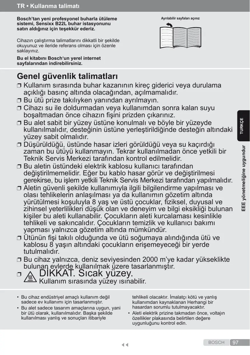 BOSCH TR • Kullanma talimatı Bosch’tan yeni profesyonel buharla ütüleme sistemi, Sensixx B22L buhar istasyonunu satın aldığınız için teşekkür ederiz. Ayrılabilir sayfaları açınız Cihazın çalıştırma talimatlarını dikkatli bir şekilde okuyunuz ve ileride referans olması için özenle saklayınız. Bu el kitabını Bosch‘un yerel internet sayfalarından indirebilirsiniz. Genel güvenlik talimatları