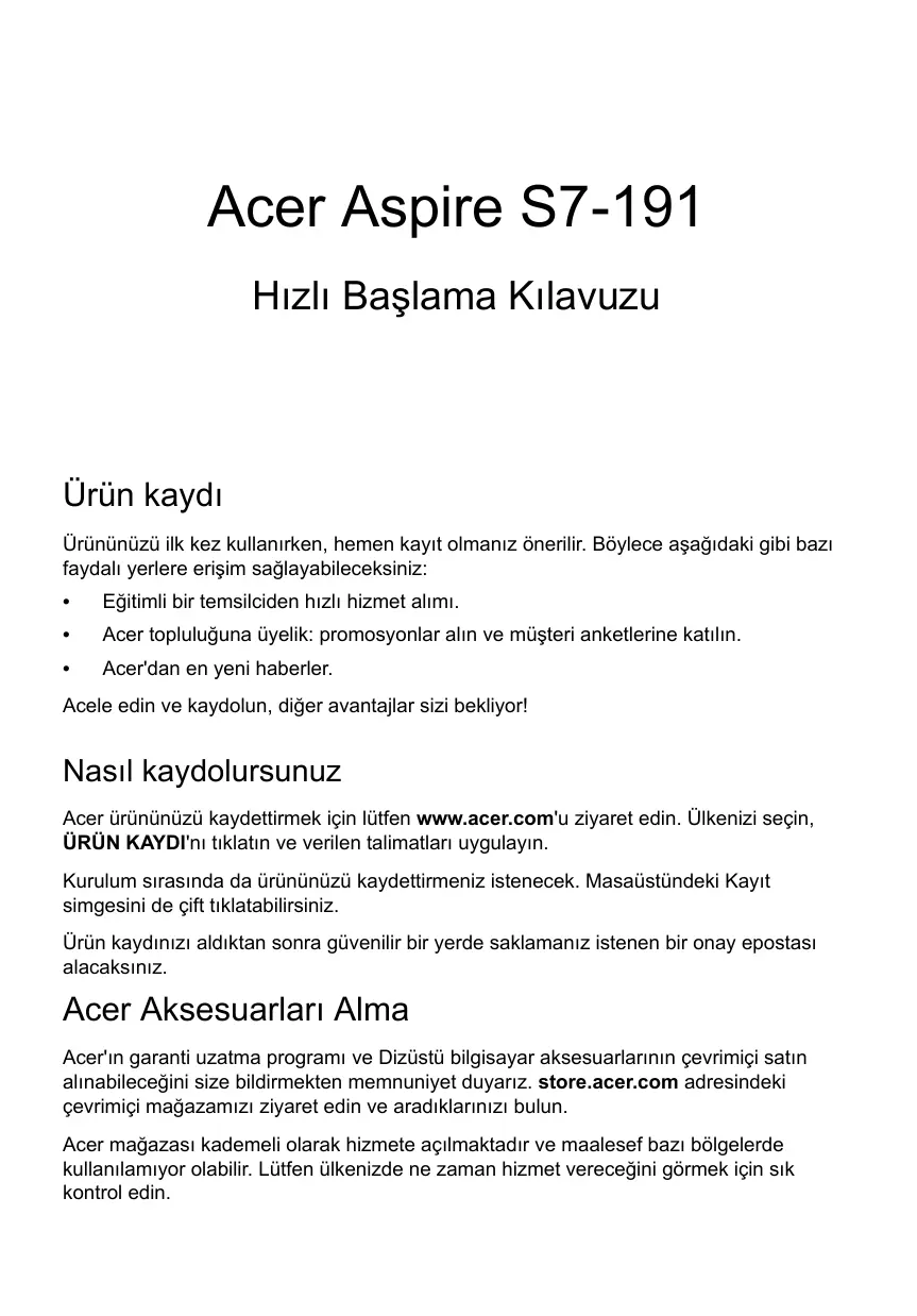 Cihazın kılavuzunu ücretsiz bulun ASPIRE S7-191 ACER PDF formatında.