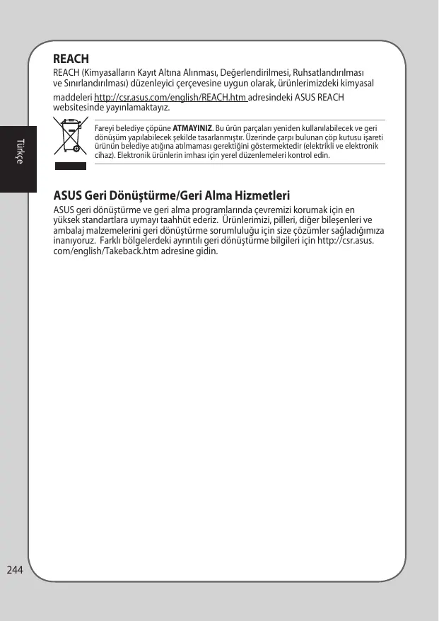 REACH REACH (Kimyasalların Kayıt Altına Alınması, Değerlendirilmesi, Ruhsatlandırılması ve Sınırlandırılması) düzenleyici çerçevesine uygun olarak, ürünlerimizdeki kimyasal maddeleri http://csr.asus.com/english/REACH.htm adresindeki ASUS REACH websitesinde yayınlamaktayız. Türkçe
