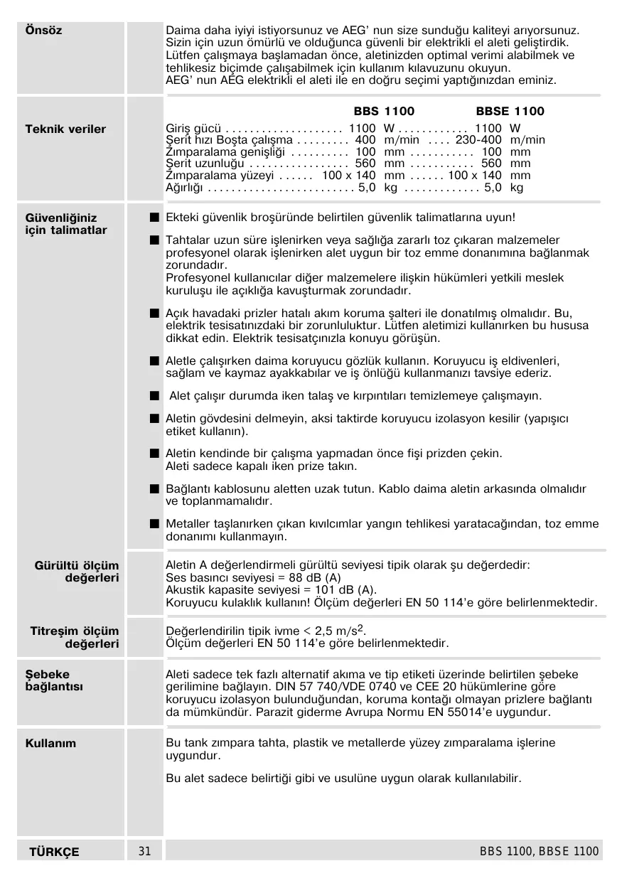 Daima daha iyiyi istiyorsunuz ve AEG’ nun size sundugu kaliteyi anyorsunuz. Sizin için uzun 6mürlü ve olduÿgunca güventi bir elektrikli el aleti gelistirdik. Lütfen çalismaya baslamadan ônce, aletinizden optimal verimi alabilmek ve tehlikesiz bicimde çalisabiimek için kullanim kilavuzunu okuyun. AEG nun AËG elektrikli el aleti ile en doÿru seçimi yaptiginizdan eminiz. BBS 1100 BBSE 1100 Giris gücü . .. 1100 W Serit hiz Bosta çaligma :230-400 m/min Zimparalama genislidi . 100 mm Serit uzunlugu . 560 mm Zimparalama yüzeyi 2100 x 140 mm 100 x 140 mm. Agirhgi . 5,0 kg 5,0 kg Ekteki güvenlik brosüründe belirtilen güvenlik talimatlarina uyun! Tahtalar uzun süre islenirken veya saÿlÿa zararl toz çikaran malzemeler profesyonel olarak islenirken alet uygun bir toz emme donanimina baÿlanmak zorundadir. Profesyonel kullanicilar diger malzemelere iliskin hükümleri yetkili meslek kurulugu ile agikhÿa kavusturmak zorundadir. AGik havadaki prizler hatali akim koruma salteri ile donatilmis olmalidir. Bu, elektrik tesisatinizdaki bir zorunluluktur. Lütfen aletimizi kullanirken bu hususa dikkat edin. Elektrik tesisatçinizla konuyu gürüsün. Aletle çalisirken daima koruyucu gëzlük kullanin. Koruyucu is eldivenleri, saÿlam ve kaymaz ayakkabilar ve is ônlüÿü kullanmanizi tavsiye ederiz. Alet çalisir durumda iken talas ve kirpintlani temizlemeye çalismayin. Aletin gôvdesini delmeyin, aksi taktirde koruyucu izolasyon kesilir (yapisici etiket kullanin). Aletin kendinde bir çalisma yapmadan ônce fisi prizden çekin. Aleti sadece kapali iken prize takin. Baÿlanti kablosunu aletten uzak tutun. Kablo daima aletin arkasinda olmalidir ve toplanmamalichir. Metaller taslanirken çikan kwlcimlar yangin tehlikesi yaratacaÿindan, toz emme donanimi kullanmayin. Aletin À deÿerlendirmeli gürültü seviyesi tipik olarak su deÿerdedir: Ses basinci seviyesi = 88 dB (A) Akustik kapasite seviyesi = 101 dB (A). Koruyucu kulaklik kullanin! Ôlçüm deÿerleri EN 50 114’e gôre belirlenmektedir. Deëerlendirilin tipik ivme < 2,5 m/s2. Ôlçüm degerleri EN 50 114’e gôre belilenmektedir. Aleti sadece tek fazl alternatif akima ve tip etiketi üzerinde belirtilen sebeke gerilimine baÿlayn. DIN 57 740/VDE 0740 ve CEE 20 hükümlerine gôre Koruyucu izolasyon bulunduÿundan, koruma kontaëi olmayan prizlere baÿlanti da mümkündür. Parazit giderme Avrupa Normu EN 55014'e uygundur. Bu tank zimpara tahta, plastik ve metallerde yüzey zmparalama islerine uygundur. Bu alet sadece belirtigi gibi ve usulüne uygun olarak kullanilabilir. BBS 1100, BBSE 1100