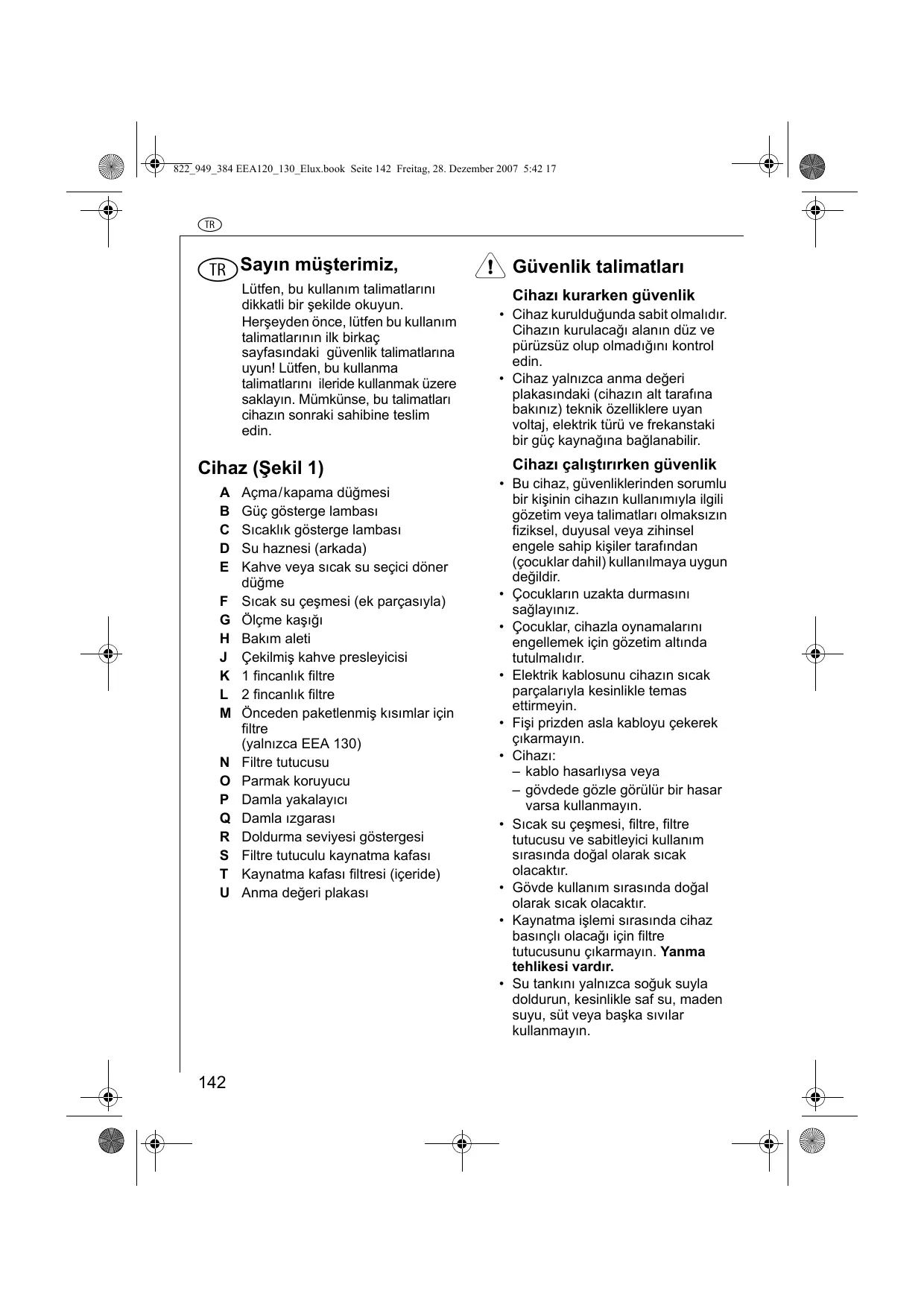 Açma/kapama düğmesi Güç gösterge lambası Sıcaklık gösterge lambası Su haznesi (arkada) Kahve veya sıcak su seçici döner düğme Sıcak su çeşmesi (ek parçasıyla) Ölçme kaşığı Bakım aleti Çekilmiş kahve presleyicisi 1 fincanlık filtre 2 fincanlık filtre Önceden paketlenmiş kısımlar için filtre (yalnızca EEA 130) Filtre tutucusu Parmak koruyucu Damla yakalayıcı Damla ızgarası Doldurma seviyesi göstergesi Filtre tutuculu kaynatma kafası Kaynatma kafası filtresi (içeride) Anma değeri plakası 1 Güvenlik talimatları Cihazı kurarken güvenlik